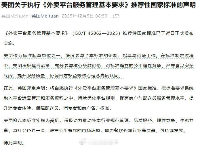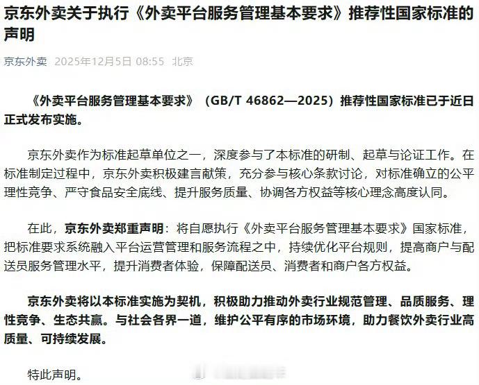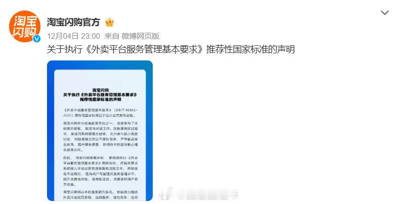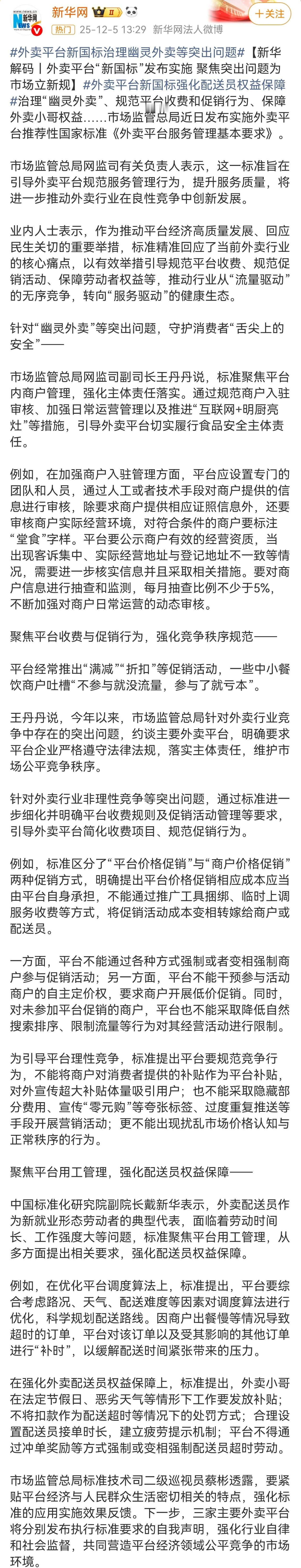 12月5日,饿了么官方宣布,原“饿了么”App图标与启动页将统一显示为“淘宝闪购”,原“饿了么”字样缩小置于副标位置,整体色调也从蓝变橙。原“饿了么”骑手服装、配送箱等品牌触点,也将在近期全部更换为“淘宝闪购”标识。饿了么APP已更新为淘宝闪购外卖平台新国标治理幽灵外卖等突出问题美团曾给饿了么开起“追悼会”,被网友质疑为碰瓷营销,美团所谓的“致敬”海报,实则暗指饿了么从独立外卖平台变成了淘宝闪购的履约基础设施,借机达到巩固外卖用户认准美团的心理潜意识。目前,美团外卖占据绝对主导地位,饿了么日活用户仅为美团的四分之一,且用户粘性持续下滑。由于双方激烈竞争,美团曾因强制商户“二选一”限制商户同时入驻多个平台,被饿了么起诉,法院判定构成不正当竞争,判决美团赔偿饿了么100万元。12月4日,《外卖平台服务管理基本要求》正式发布,针对“幽灵外卖”、非理性竞争、骑手权益保障不足等行业痛点,“外卖新国标”从商户准入、促销规则、劳动保护到争议解决,首次给出全国统一“底线式”规范。该文件虽为推荐性,但国家市场监管总局明确要求“平台企业自愿执行并向社会公开承诺”,美团、饿了么(淘宝闪购)、京东外卖随后表态“全面对标”,后续将以平台自律、行政抽查等方式落地。“外卖新国标”明确标划三条“红线”,即禁止强制促销、禁止幽灵外卖、禁止算法压榨骑手。后续,平台不得将把营销成本转嫁给商户;商户入驻必须提供“带定位的一镜到底视频”供平台核验,证照、地址、后厨环境三者一致方可上线;骑手连续接单满4小时强制停单20分钟,日接单超过8小时需二次确认,平均配送时速按≤15km/h计算,平台不得以冲单奖、超时扣款方式变相迫使骑手疲劳或超速。具体来看,骑手权益保障还需进一步细化、落实,如增加节假日休息,每周至少休1天,并建立高温、恶劣天气补贴规则,绩效奖、全勤奖不得捆绑强制出勤,尤其要重视骑手的职业安全,平台须为骑手购买意外险,鼓励探索社保、职业培训、疗休养等多元保障 。在我看来,“外卖新国标”能有效避免平台的无序竞争,而后续“外卖国标监督”小程序的上线,将给消费者、骑手、商户提供发声、投诉的渠道,倒逼平台进行合规经营,外卖行业亟需从粗暴价格战转向拼服务、拼食品安全,更要做好对骑手的保护。饿了么app已更新为淘宝闪购