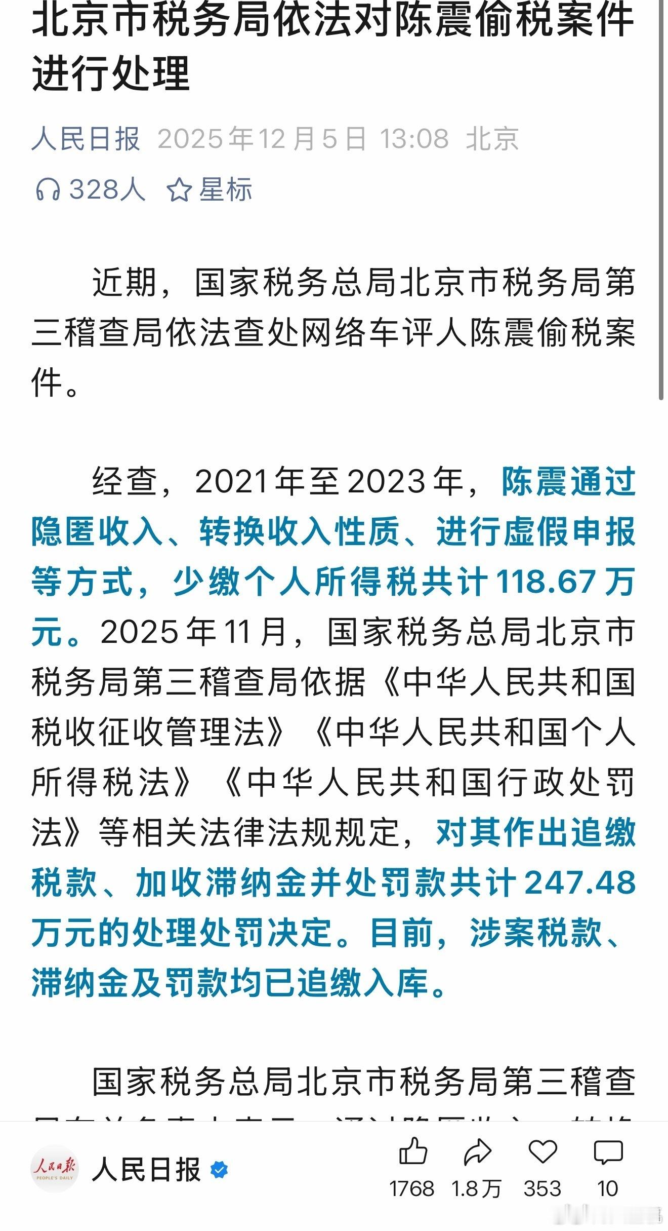 陈震偷税案陈震有难,全网点赞!平时吃黑流量吃多了,也遭到了反噬,一个车圈顶流网红大V,沦落到这个地步,也是令人唏嘘,可见网友对他有多不认可。补税两百多万,其实对于陈震来说也就是两三个商单的事儿,但现在不仅全网禁言和封号,而且各大官号都发文通报了,问题肯定没那么简单,所以就看陈震背后的能量大不大,能不能保他,否则这种状况很难复出了,即使复出也没几个品牌敢找他。当然,瘦死的骆驼比马大,震哥早就赚到了我们普通人这辈子都用不完的钱,即使不混互联网也比我们潇洒多了。
