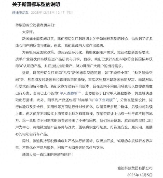 中国青年报客户端北京12月5日电(中青报·中青网记者贾骥业)今天中午,雅迪科技集团有限公司(简称“雅迪电动车”)发布《关于新国标车型的说明》,表示该公司生产的“毛豆”电动车(“单人通勤版”)在车型设计上有一些考虑不周的地方,给一直期待不同需求的消费者带来了不便与困扰,对此深表歉意。
