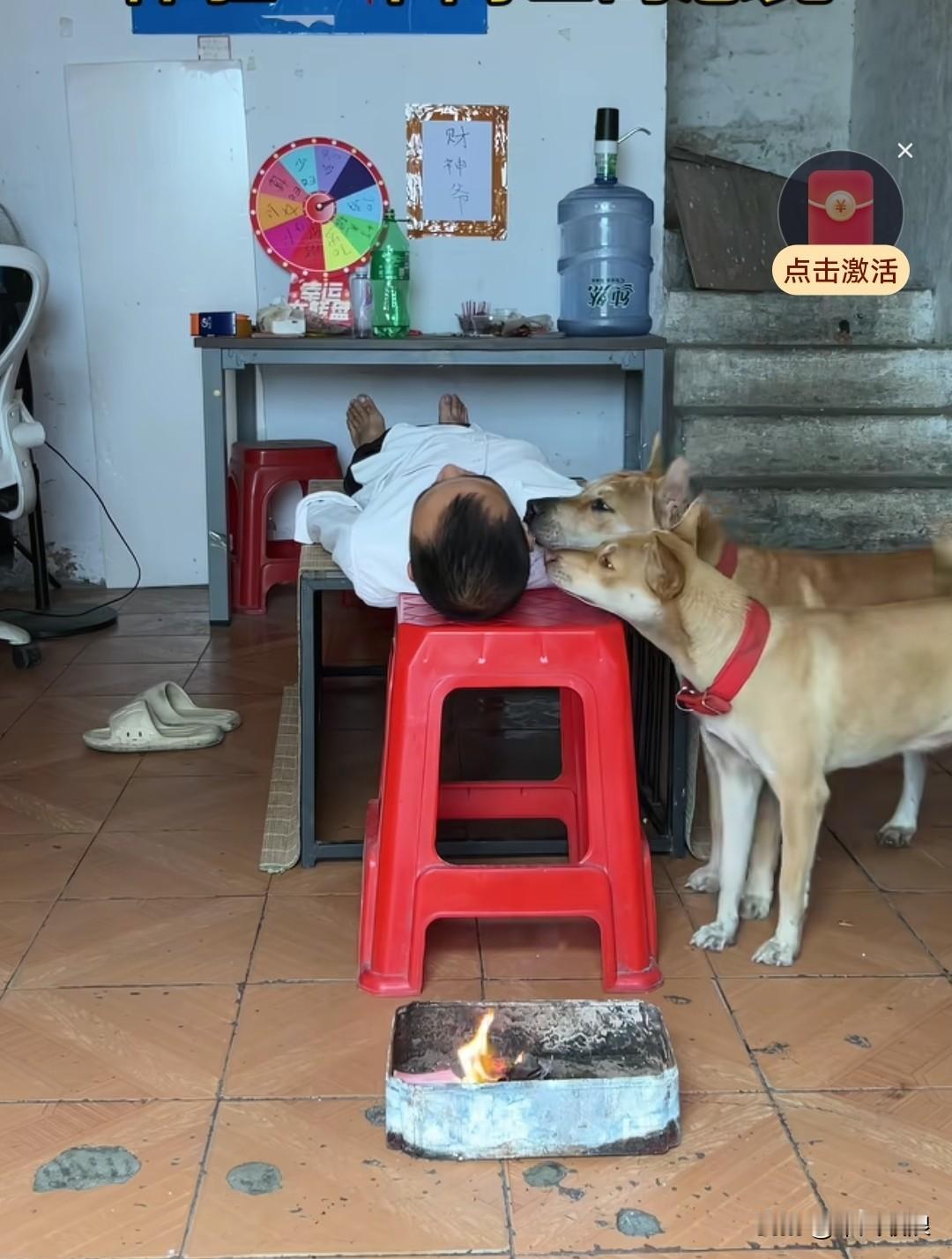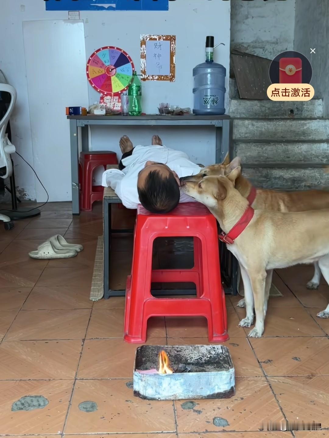 主人为测试狗狗的反应,假装离世观察它们的举动。两只狗狗立刻凑过来,用舌头轻舔主人