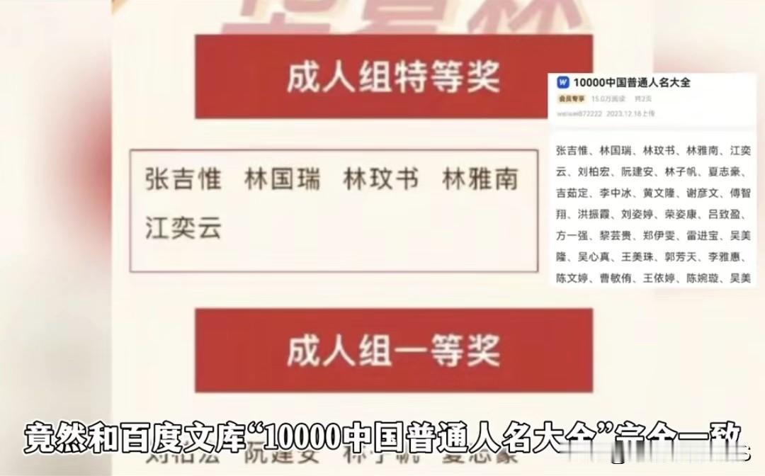 全国最忙“5人组”:上午评千万项目,下午拿书法奖,晚上还得赶少儿春晚! 有人办了个“华夏杯”书法大赛,收了选手30元报名费,结果获奖名单一出来,眼尖网友发现成人组特等奖的5个人名,居然和百度文库里“中国普通人名大全”前5个名字一毛一样! 有网友一查,湖北十堰一个3188万的政府采购项目评审,也是这5个人!合着他们上午评千万项目,下午拿书法奖,晚上还得去少儿春晚表演?这是长了八只手吗? 网友们接着扒,发现这5人还出现在广东某企业研究员名单、少儿培训机构春晚报名里……感情是全国到处“赶场”啊! 明明人名大全有1万个名字可选,这群造假的人偏偏就复制前5个,懒到连脑子都不想动,真当大家是傻子呢? 说白了,这比赛就是个骗局,评委是假的,奖金是不发的,就指着选手那30块报名费赚钱呢!
