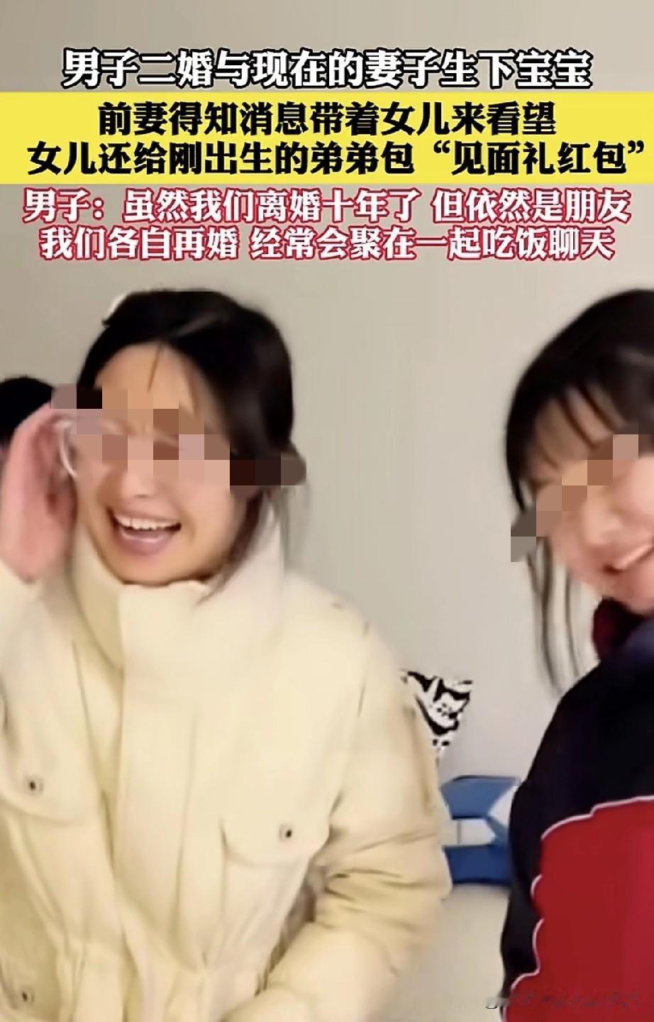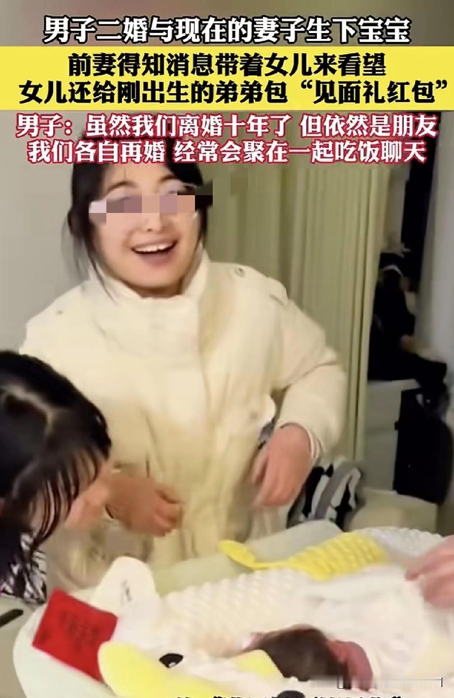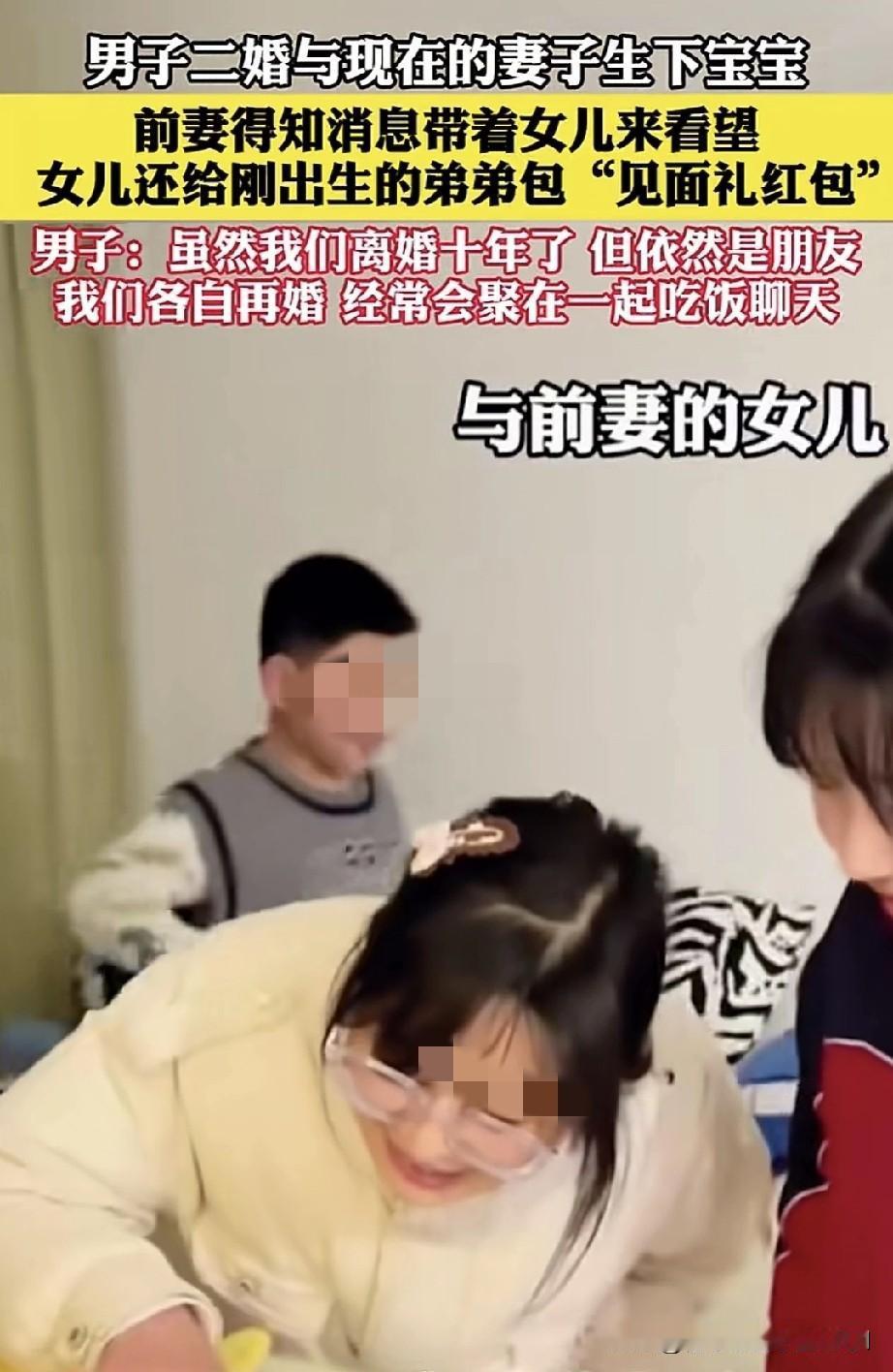 男子二婚喜得男宝,前妻获悉消息后,带着女儿前来探望。女儿还给刚出生的弟弟包了个红包。这对夫妻离婚已有10多年,如今仍能像朋友一般相处,且都各自再婚。平日里,两家人还会相聚在一起吃饭聊天。 既然离了婚还能如此融洽,那当初为何又要分开?离了婚还频繁聚餐,有没有顾及各自现任的感受呢?这看似表明两人离婚后都过得不错,毕竟但凡有一方过得不如意,恐怕都会心生怨恨。 然而,表面的和谐之下,孩子们承受着怎样的痛苦,也只有他们自己清楚。离婚后,双方还是少些来往为好,尤其是有一方再婚之后。一个前妻,一个现妻,同处一室,别提多尴尬了。婚姻要么一生相伴,要么一别两宽,切莫高估人性。 对此大家怎么看?
