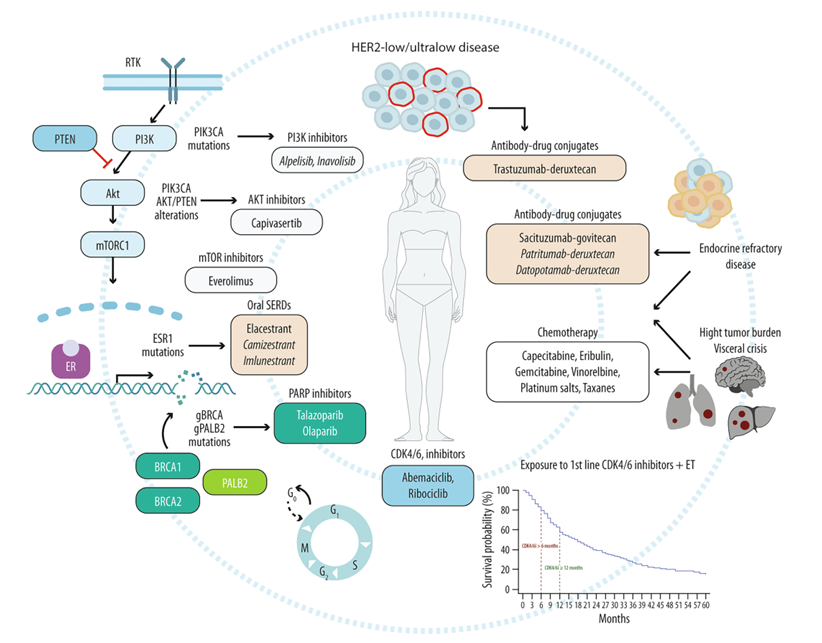 激素受体阳性/人表皮生长因子受体2(HR+/HER2-)乳腺癌是临床上最常见的亚型,约占全部乳腺癌病例的70%。随着细胞周期蛋白依赖性激酶4/6抑制剂(CDK4/6i)联合内分泌治疗(ET)成为晚期患者的一线标准方案,其生存期和生活质量得到了显著改善。然而,绝大多数患者最终仍会面临疾病进展,如何选择后续治疗方案是临床面临的关键挑战。当前,二线治疗选择不仅包括传统化疗和ET,还涵盖了PI3K通路抑制剂、口服选择性雌激素受体降解剂(SERD)、PARP抑制剂(PARPi)以及新型抗体-药物偶联物(ADC)等[1]。面对众多选项,如何为不同患者制定个体化策略,成为临床医生亟需解决的难题。