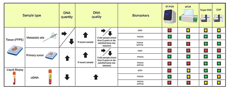 2.根据样本类型和检测方法进行的分子检测。绿色代表生物标志物检测可靠性及准确性高,黄色表示具有一定的实用性但存在潜在局限性,红色则表示对特定生物标志物的适用性低或性能欠佳。