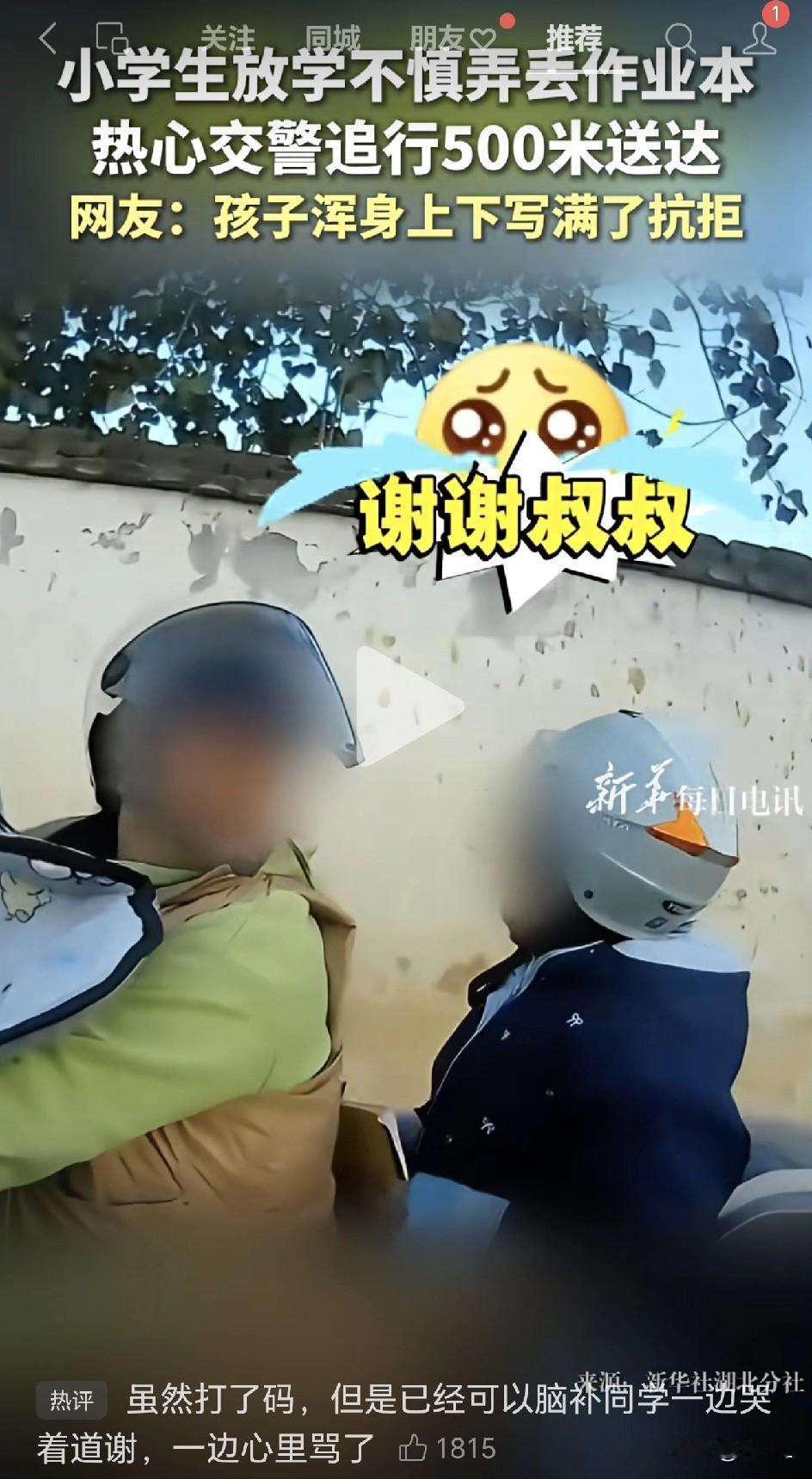 小学生作业掉路上,交警狂追500米送回!孩子偷摆手势:快拿走!网友:浑身上下写满了抗拒! 近日,一段小学生放学作业掉了,却被热心的交警叔叔狂追500米送回的视频,在网上突然爆红,全网都在求小朋友的心理阴影面积! 放学时段,妈妈骑电动自行车去接刚放学的孩子,小朋友麻利的带上头盔,跳上了后座。谁也没注意到——一本作业,“啪”一声掉在了马路中央。 妈妈浑然不觉,载着孩子径直离去。 好巧不巧,一位热心的交警叔叔,正好骑着摩托车巡逻到学校门口,一眼就看见了地上那本孤零零的作业,再抬头,母子俩已走远。 交警叔叔喊了一声,“同学,你的作业掉了!”却发现母子俩并没有回应,就赶紧把作业捡起来,跨上摩托,轰起油门——追! 作业对小学生来讲,那可是非常非常重要的东西,绝对不能丢! 交警叔叔一路狂奔,追了500米才追上了母子俩。 “同学,你的作业!”交警叔叔追上以后,开口叫小朋友。 小朋友还一脸懵圈,“我的?” 交警点头。没想到,这孩子竟然在妈妈背后,偷偷地、用力地朝交警摆手,一脸“求求你快拿走”的表情。 但负责任的交警没看懂——或者假装没看懂。他加速超车,拦停了电动车,再次郑重递上作业:“同学,你的作业!” 妈妈这才明白,赶紧跟孩子说,“快点跟警察叔叔说谢谢。” 只见孩子把脸扭到一边,只留下一个写满“生无可恋”的后脑勺,咬着牙挤出一句:“谢谢叔叔……” 全网笑疯:他快急哭了! 视频一发上网,瞬间爆火。评论区一片“哈哈哈”刷屏: “小学生:我的手都快摇断了,叔叔没有看到吗?” “那个拒绝的手势都快扬飞起来了!” “感觉那句谢谢叔叔快要哭出来了!” “一个故意丢,一个故意追。” “警察叔叔:怀疑你是故意掉的,喊了你这么多次都不回头。” “咬牙切齿的:谢谢叔叔!” “全国人民都知道熊孩子扔作业本了。” “饭都笑喷出来了!” “好不容易丢的。” “孩子:今晚的快乐没了。” 一场“一个真敢丢,一个真敢追”的暖心巧合! 其实孩子未必真是故意,交警更是责任在心。可这阴差阳错的500米“护送作业”,却让无数网友回忆起小时候“作业消失”的幻想——果然,童话里都是骗人的。 一本作业,一份责任心,一场全网围观的“小确丧”与“小温暖”。 只是不知道今晚,这位小朋友会不会一边写作业一边嘟囔:“警察叔叔,您下次……可以不用这么负责的……” 信息来源于新华社,侵联删!