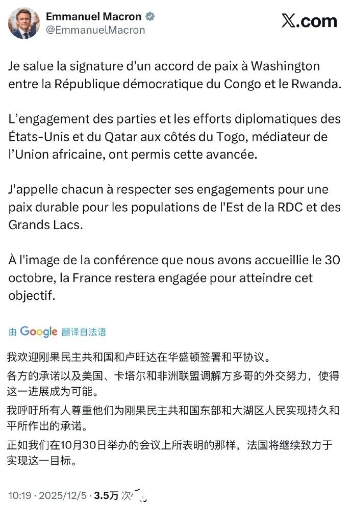 马克龙在成都期间,还关注着刚果和卢旺达两个国家的最新情况! 12月5日,马克龙在四川大学访问,早上的时候因为在户外跑步还上了热搜,引起不少网友的大赞和围观,随后马克龙就去了四川大学访问。 值得一提的是,马克龙在成都期间,还关注着刚果和卢旺达这两个国家的最新情况,原来当天,川普和刚果以及卢旺达总统召开一个会议,在会议上川普主持两个国家签署和平协议,估计这也是川普促使以色列和加沙和平以来的又一个战绩。 随后马克龙看到这个消息后,还在自己的社交平台发文,经过各方的努力刚果和卢旺达终于达成了和平协议,当然了马克龙也非常赞赏这个做法,并称法国也一直支持这个目标,不得不说马克龙真的是太用心了。