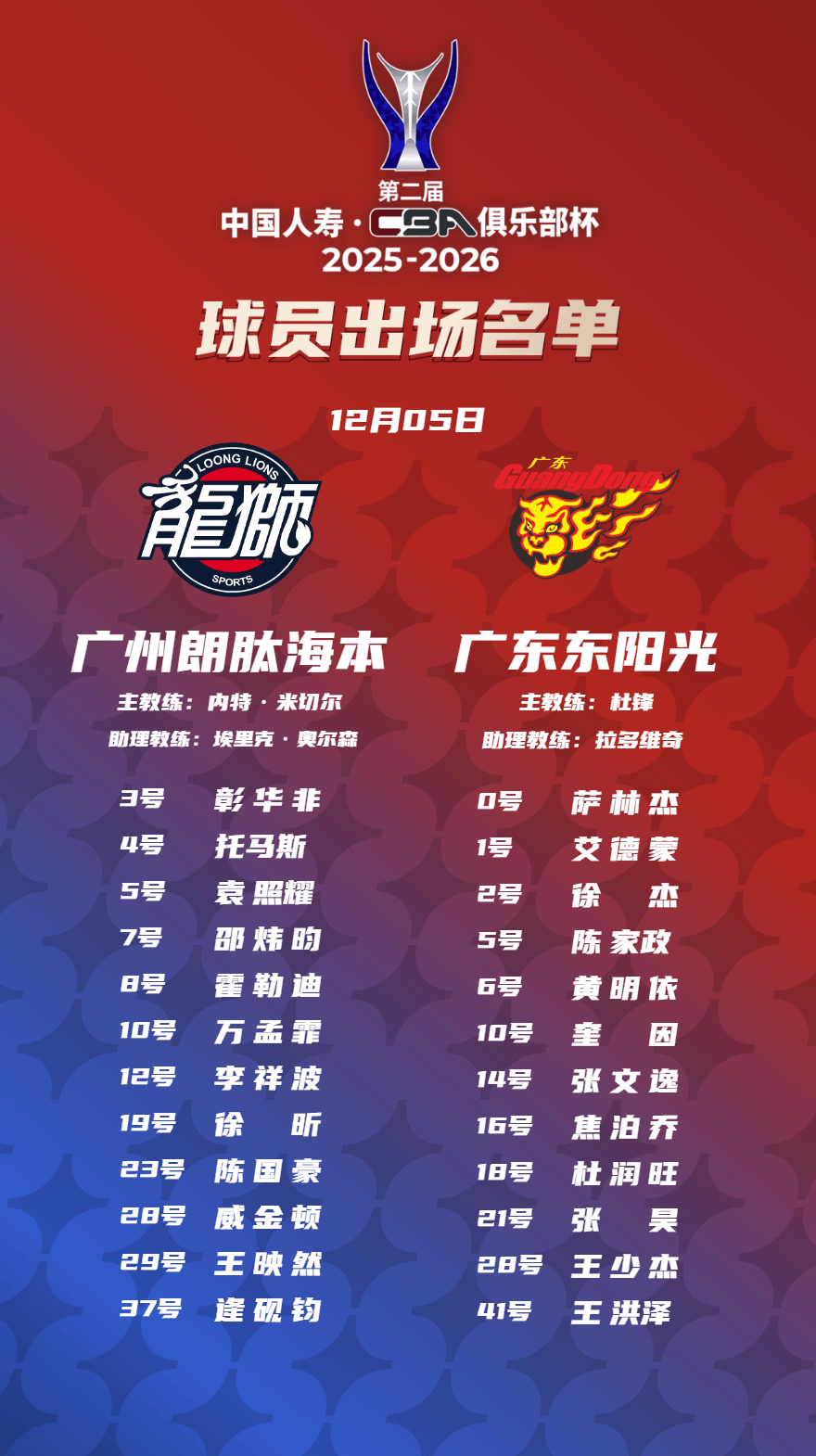 赛前,CBA官方公布双方大名单。