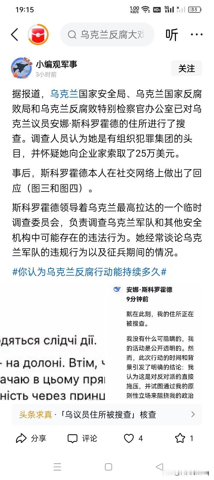 内部反击? 乌克兰似乎算是西方认为的一个民主、自由的国家,所以,乌克兰最高拉达议员好像也可以随心所欲的直言不讳,痛陈时弊,甚至是还可能信口开河,无端指责,这个从网络上不断传闻出现的议员们的各种各样的言论,估计就可以略见一斑。 网络上的消息:乌克兰安全局、乌克兰国家反腐败局,以及乌克兰反腐败检察官办公室共同联合,好像开始对乌克兰最高拉达议员安娜·斯科罗霍德的办公室和住所进行了搜查。调查人员怀疑她是犯罪集团的头目,并有向企业勒索25万美元资金的嫌疑。 实际上,安娜·斯科罗霍德利用议员身份,大概不断对军队内部事情进行调查,与之同时,她好像经常对乌克兰的军队和征兵工作,说三道四,指手画脚,还有可能是横加指责,横挑鼻子竖挑眼。 不过,安娜·斯科罗霍德表面上看去非常的漂亮,并且和善。