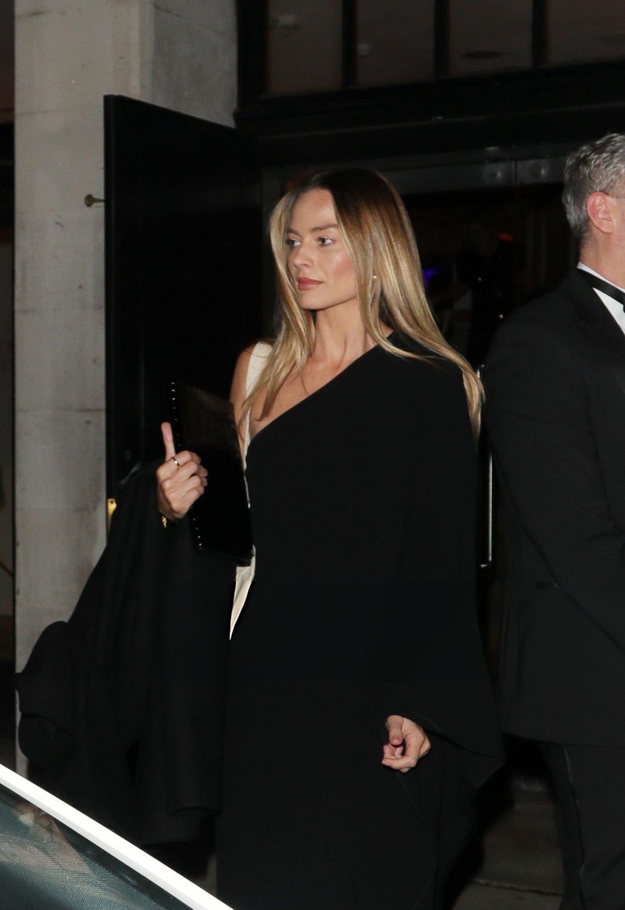 Margot Robbie今日在伦敦参加一场慈善晚宴,穿了一条黑色单肩礼服裙,外