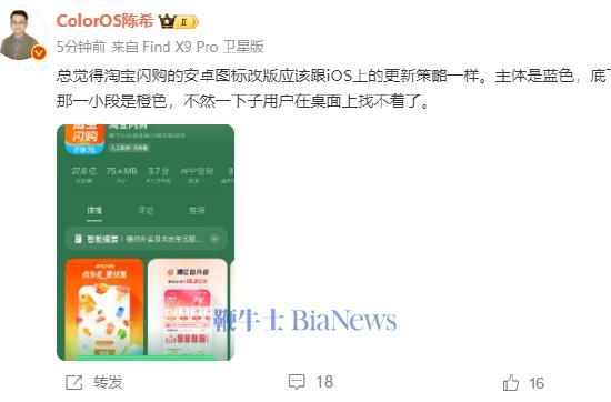 12月5日,OPPOColorOS设计总监“ColorOS陈希”发微博评价淘宝闪购的安卓图标。