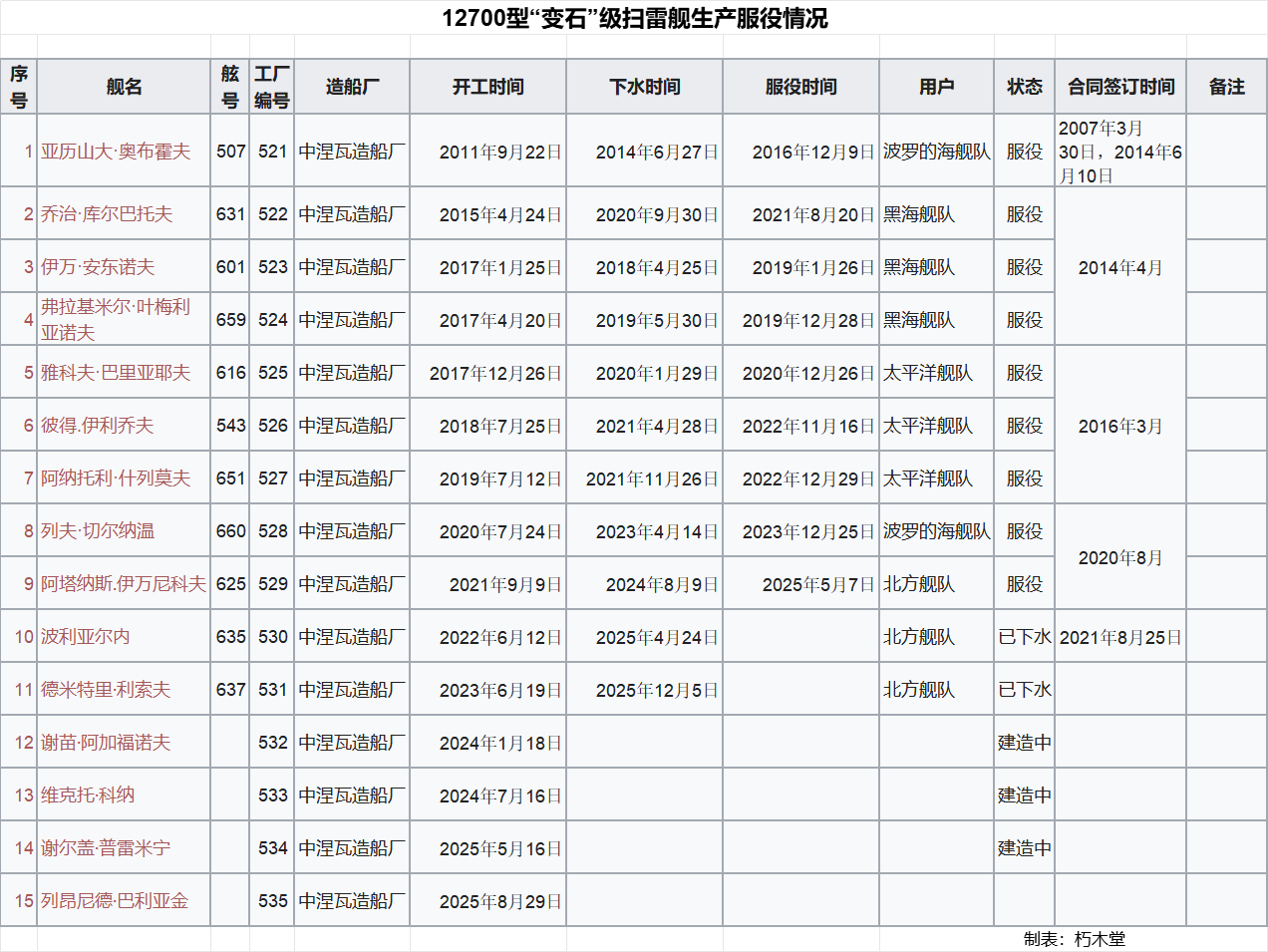 12700型“变石”级扫雷舰11号舰 “德米特里.利索夫”号下水2025年12月5日,俄罗斯联合造船集团官网报道,当天,位于圣彼得堡的中涅瓦造船厂(SNSZ,隶属于俄罗斯联合造船集团公司)举行了为俄罗斯海军建造的12700型“变石”级11号舰扫雷舰“德米特里.利索夫”号(工厂编号:№531)下水仪式。该舰的名字是为了纪念苏联海军北方舰队T-120扫雷舰(美国制造的AM型)舰长德米特里.阿列克谢耶维奇.利索夫大尉(1918-1944),1944年9月24日,该舰被德国U-739潜艇的鱼雷击中,舰长以身殉职。苏联和俄罗斯海军此前有三艘以 "德米特里.利索夫 "为名的舰艇:53U型(1949-1961)、254型(1963-1972)和266M型(1972-1998)。依照海事传统,该舰举行了受洗仪式。随后,该舰的"教母"——联合造船集团总经理办公厅首席专家叶卡捷琳娜·卡利尼娜——将一瓶香槟在舰舷摔碎。下水仪式结束后,该舰将移泊至船厂的舾装码头,进行后续的完工建造工作。位于圣彼得堡的金刚石中央海洋工程设计局为俄罗斯海军研制了12700型“变石”级扫雷舰,该舰排水量约为890吨,最高航速16.5节。该舰属于新一代扫雷舰,被设计用来清除水雷。扫雷舰可以在海水中和海底上探测到水雷。扫雷舰无需冒险进入危险区,而是使用不同类型的扫雷具以及远程操作和自主航行的无人潜水器来清除水雷。截止目前,12700型扫雷舰的生产服役情况见附图