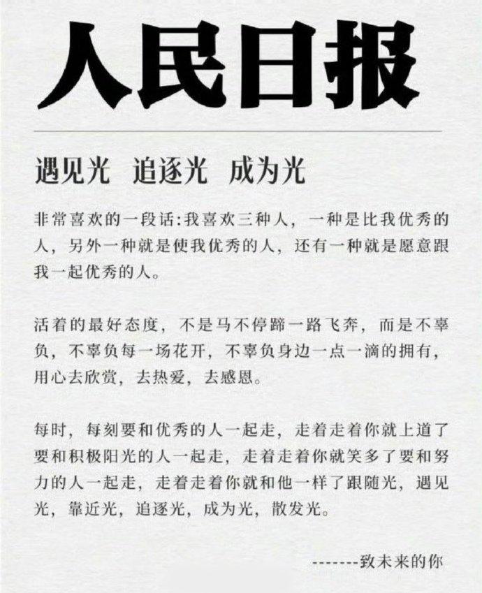 人民日报优秀文章,全是写作必备的好素材,非常喜欢的一段话,我喜欢三种人,一种是比我优秀的人,另外一种就是使我优秀的人,还有一种就是愿意跟我一起优秀的人.....多读读这些优秀文章,积累金句,提升你的表达能力。#寻美三湘##长沙新朋友#
