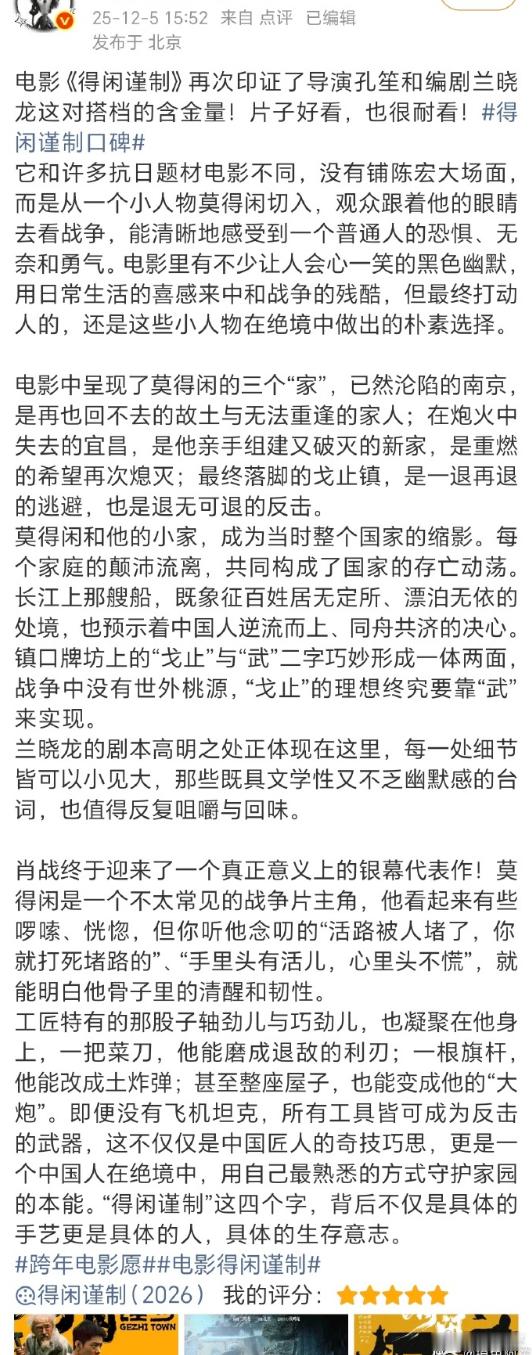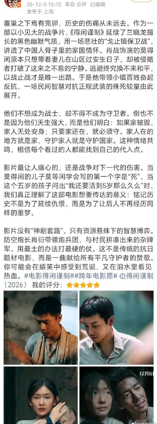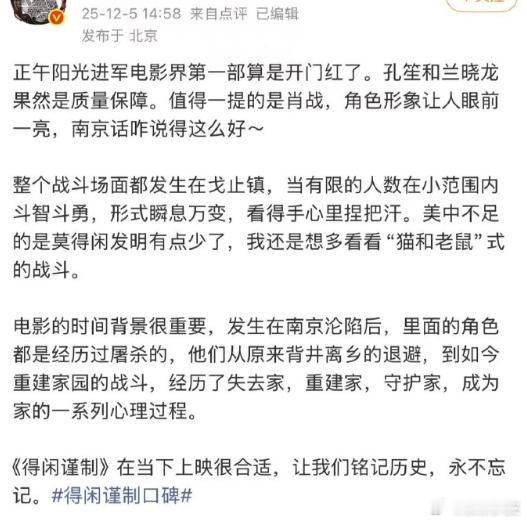 得闲谨制观影口碑 爆开!被影评人誉为“年末黑马”,纷纷给出了5星好评没有退路,那就杀出一条生路,12月6日去电影院看莫得闲!!电影得闲谨制