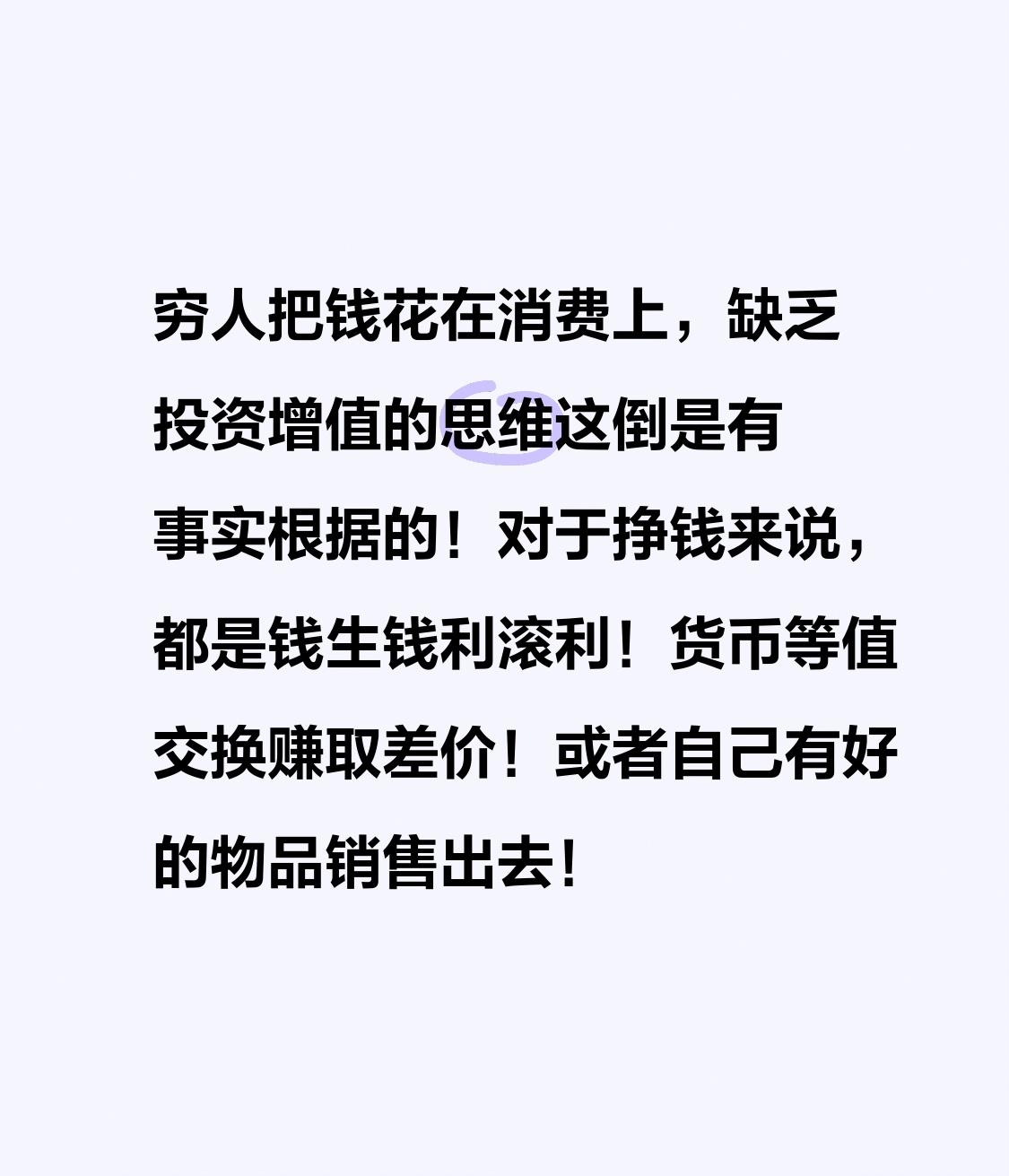 穷人把钱花在消费上,缺乏投资增值思维,这话确实有道理。就像我妈那辈人总说存钱才是硬道理,我二姨省吃俭用二十年攒了20万,结果在通胀面前,这点钱连一半房价都不够。 真正会花钱的人,会把钱花在“能生钱”的地方。我发小阿凯花3800块报工业设计课,最后升职加薪;我表姐花三个月工资参加高端商会,结识投资人开了公司。反观那些舍不得提升自己的人,看似省钱,实则亏了赚钱机会。穷人还容易陷入信息盲区,像我老家亲戚觉得读书无用,让孩子打工,结果孩子转行都没门路。所以,得转变思维,学会投资自己和人脉。 存钱观念 普通人投资思维
