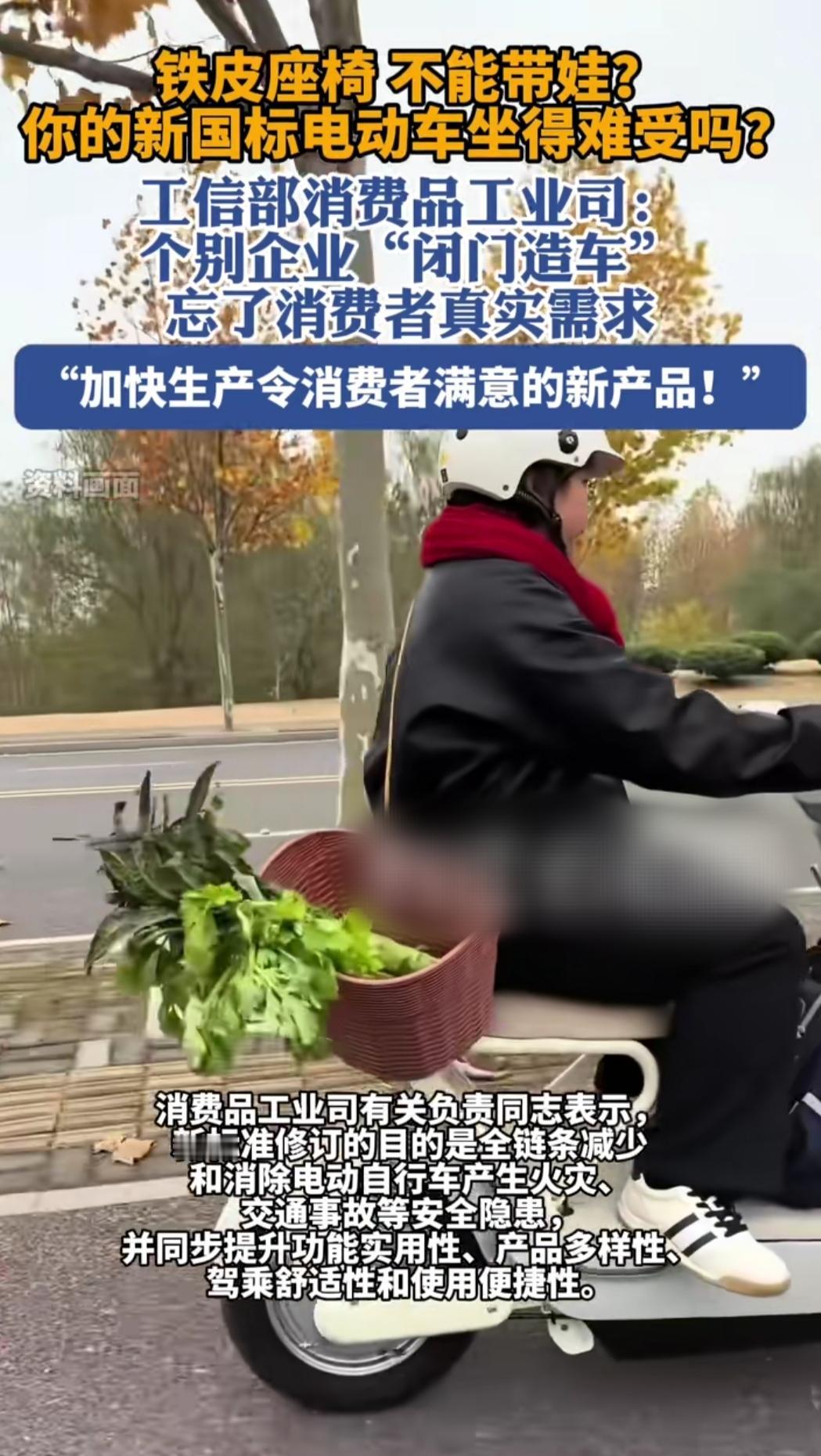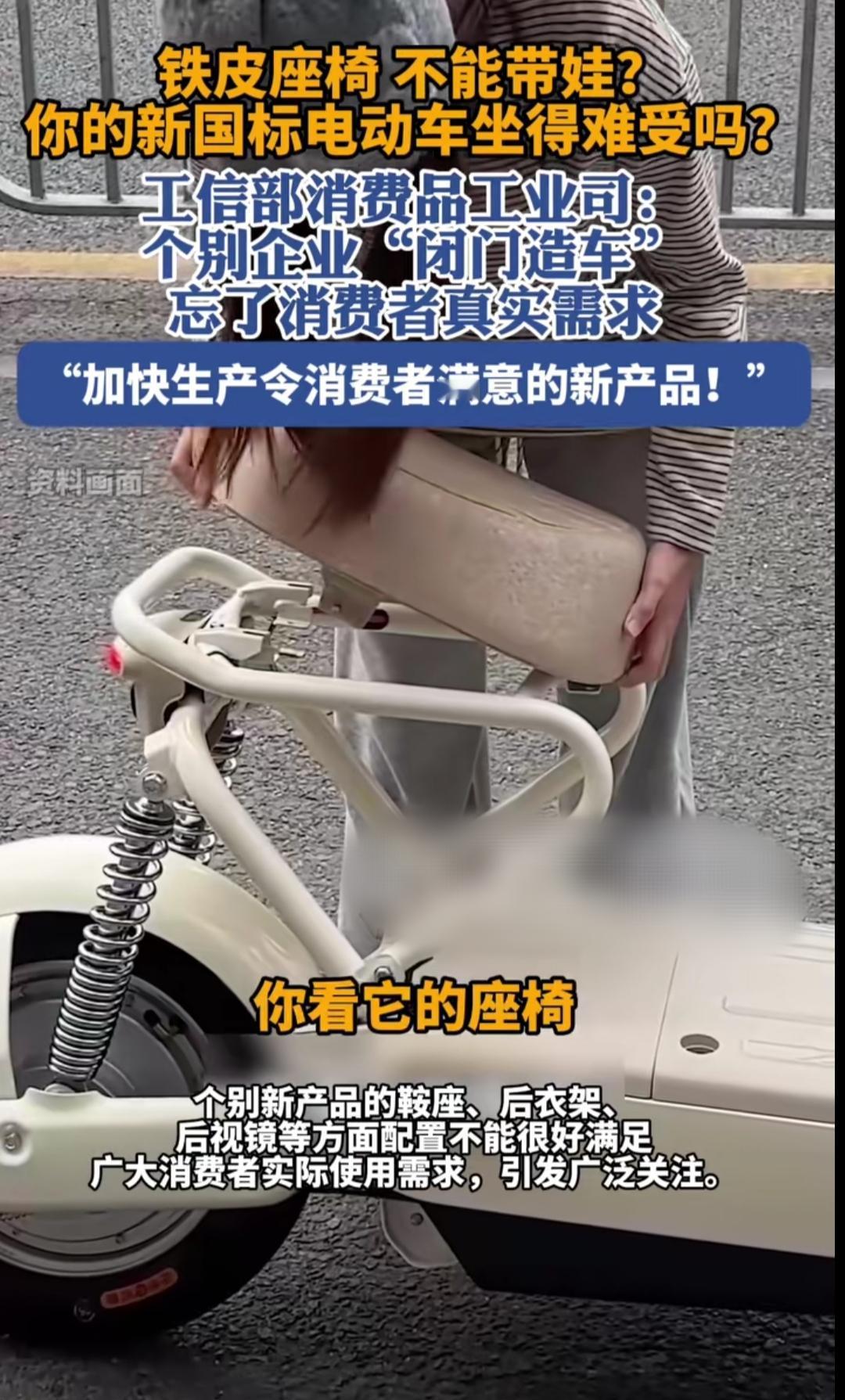 新国标电动车过渡期刚结束,不少车主一买新车就懵了:座椅是铁皮的,夏天坐上去能烫得跳起来;后衣架窄得连菜都放不稳,更别说带娃了,这哪是通勤工具,简直是“受罪神器”。 工信部都点名批评个别企业“闭门造车”,忘了老百姓要的是能舒服代步、能顺手带东西的实用车。新国标本是为了安全,可安全和实用不该是二选一啊。 咱普通人买电动车,图的就是个方便省心,不是花冤枉钱买个“中看不中用”的摆设。好在官方已经催企业优化了,希望后续新车能真的“为消费者着想”。