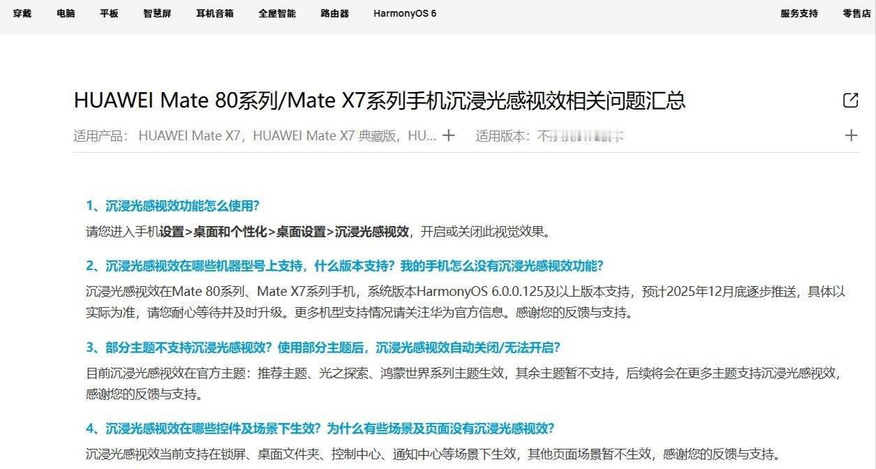 【华为鸿蒙 HarmonyOS 6 沉浸光感视效可自主选择开启 / 关闭,目前仅部分官方主题可生效】华为 Mate 80 系列 | Mate X7 采用鸿蒙 HarmonyOS 6 操作系统的新特性 —— 沉浸光感视效正式官宣,将带来交互灵动粒子、通透质感材质、气态动效变化等。华为官网对该功能的相关问题进行了汇总,并进行解答。其中提到,该功能可自主选择开启或关闭,同时目前仅部分官方主题支持该视效。沉浸光感视效功能怎么使用?请您进入手机设置 > 桌面和个性化 > 桌面设置 > 沉浸光感视效,开启或关闭此视觉效果。沉浸光感视效在哪些机器型号上支持,什么版本支持?我的手机怎么没有沉浸光感视效功能?沉浸光感视效在 Mate 80 系列、Mate X7 系列手机,系统版本 HarmonyOS 6.0.0.125 及以上版本支持,预计 2025 年 12 月底逐步推送,具体以实际为准,请您耐心等待并及时升级。更多机型支持情况请关注华为官方信息。感谢您的反馈与支持。部分主题不支持沉浸光感视效?使用部分主题后,沉浸光感视效自动关闭 / 无法开启?目前沉浸光感视效在官方主题:推荐主题、光之探索、鸿蒙世界系列主题生效,其余主题暂不支持,后续将会在更多主题支持沉浸光感视效,感谢您的反馈与支持。沉浸光感视效在哪些控件及场景下生效?为什么有些场景及页面没有沉浸光感视效?沉浸光感视效当前支持在锁屏、桌面文件夹、控制中心、通知中心等场景下生效,其他页面场景暂不生效,感谢您的反馈与支持。