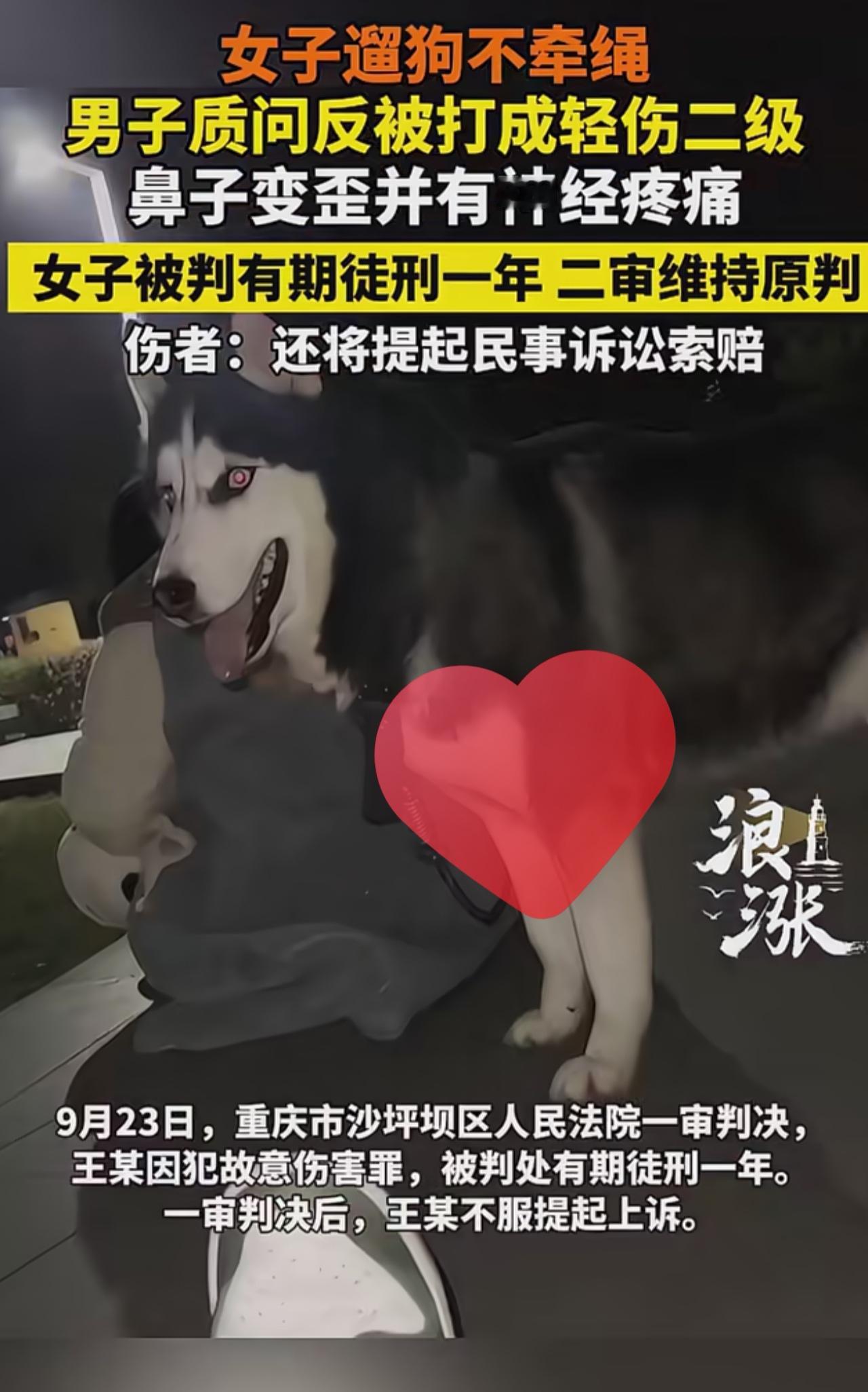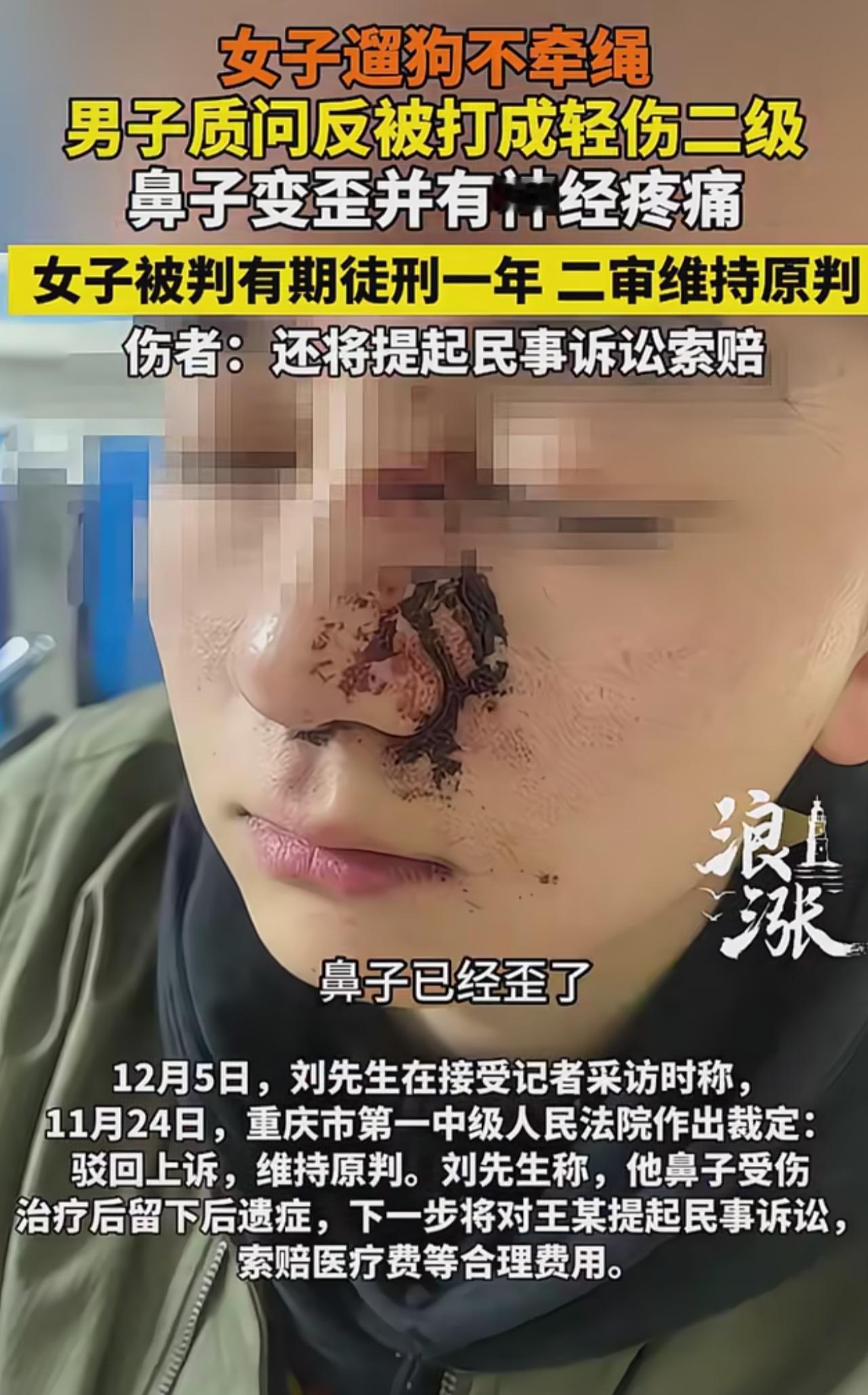 不是说养狗人很善良吗? 女子遛狗不牵绳 男子质问反被打成轻伤二级 鼻子变歪并有神经疼痛 女子被判有期徒刑一年 二审维持原判! 又判刑又赔钱,估计还要离婚,孩子还被影响。神经疼痛知道有多疼么,时时刻刻都疼,睡觉睡不好,不但精神折磨物理也折磨,我9月9号车祸,11月25号连吃药待在家养着,整整养了二个月才有点起色,有的时候疼得脑后边神经传到脖子后边,那种痛,有的时候都淌眼泪的疼。