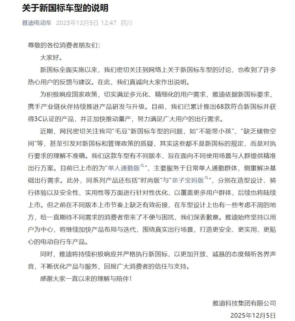 关于雅迪电动车就新国标车型设计致歉的声明,雅迪官方在12月5日发布了说明,表达了
