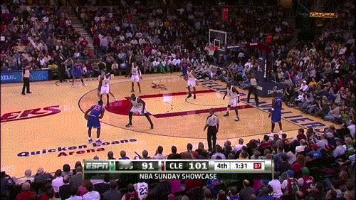 年轻詹姆斯一个罕见的晃肩变向过人。詹姆斯