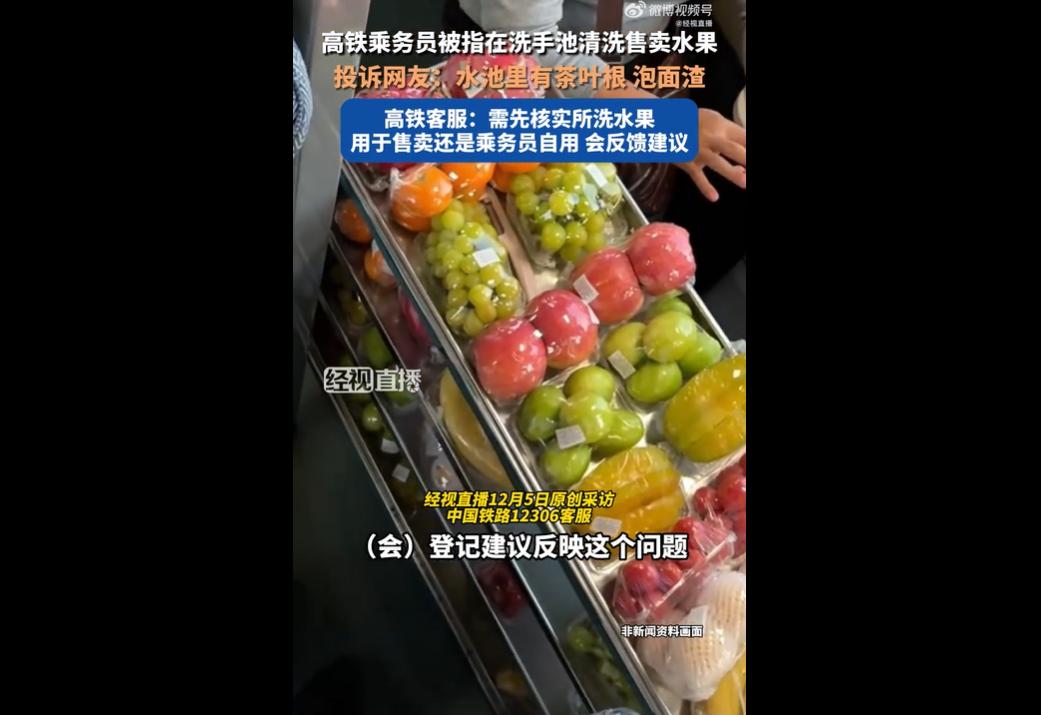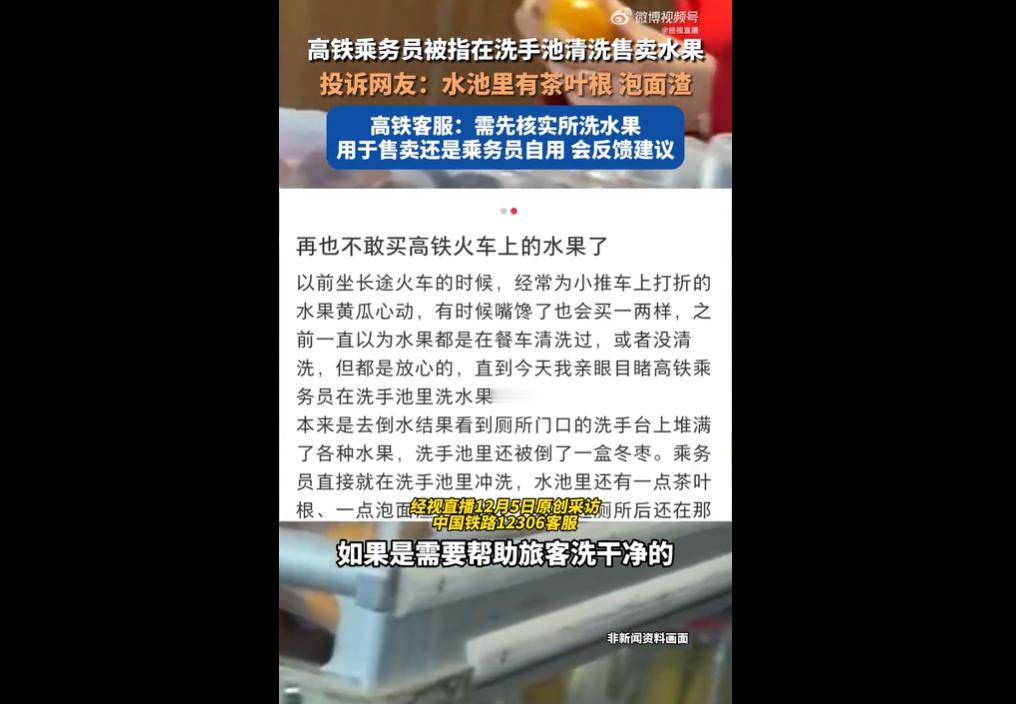 近日,网友称乘坐 G123 次列车时,目睹乘务员在残留茶叶根、泡面渣的公共洗手池清洗售卖用冬枣,洗好的冬枣还堆在湿擦手纸上,她次日通过 12306 投诉。 12306 回应称需先核实水果是售卖还是自用,称公共洗手池供乘务员与旅客共用,餐车有专用水池但不对旅客开放,已记录 “改至餐车清洗” 的建议并上报,还表示需当事人详述情况进一步处理。 乘务员在脏污的公共洗手池洗售卖水果,明显违反食品安全规范,这种操作让常买高铁水果的乘客怎能安心? 旅客图便利选择高铁商品,本质是信任其服务标准,而公共洗手池并非食品清洗场所,残留杂物极易造成污染。 12306 先核实 “售卖与否” 的回应虽合规,但更该直面操作漏洞 —— 餐车本有专用水池,却未用于售卖食品清洗,暴露服务衔接问题。 此前铁路已有餐饮卫生新国标,此次争议提醒铁路部门:与其等投诉再整改,不如主动规范流程,将清洗环节移至专用区域,用看得见的卫生操作守住信任底线。