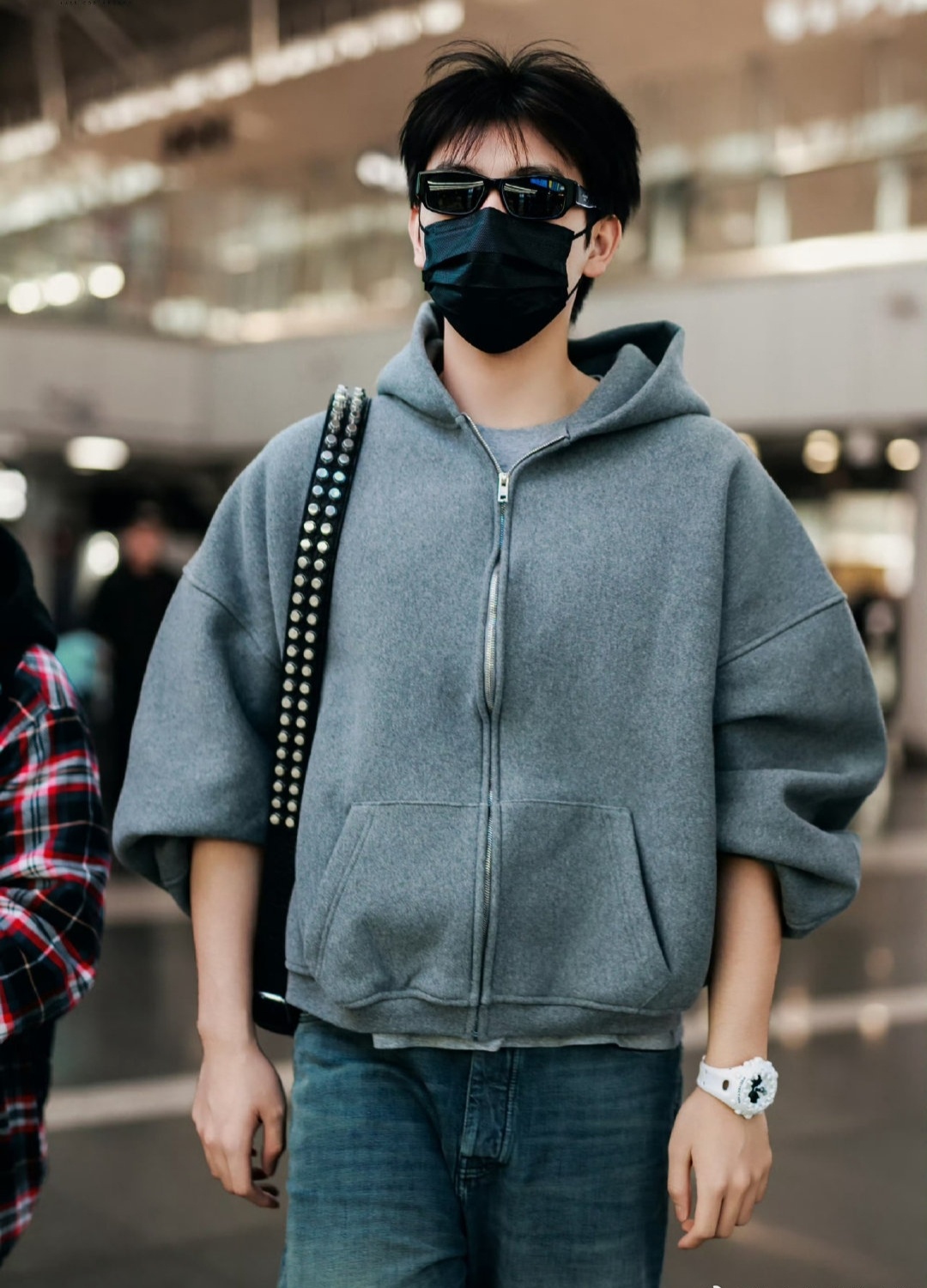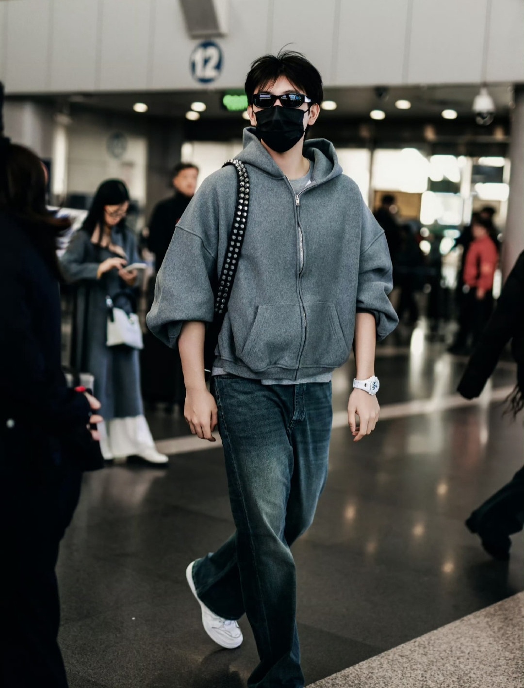 站姐跟拍陈飞宇,可能是把陈飞宇拍的受不了了,于是走到一个安检口禁止拍照的牌子前面,默默的用手指了指牌子。那意思就说,这里禁止拍照,站姐们别拍了。说实话,公共场合被一群卖图的站姐围追堵截拍照,其实挺烦的。陈飞宇能保持情绪做到这份上不发火,也是不容易。不过我好奇的是,他手腕上那个表是不是很贵呀,感觉特别抢镜头,陈飞宇好像特别喜欢的样子。