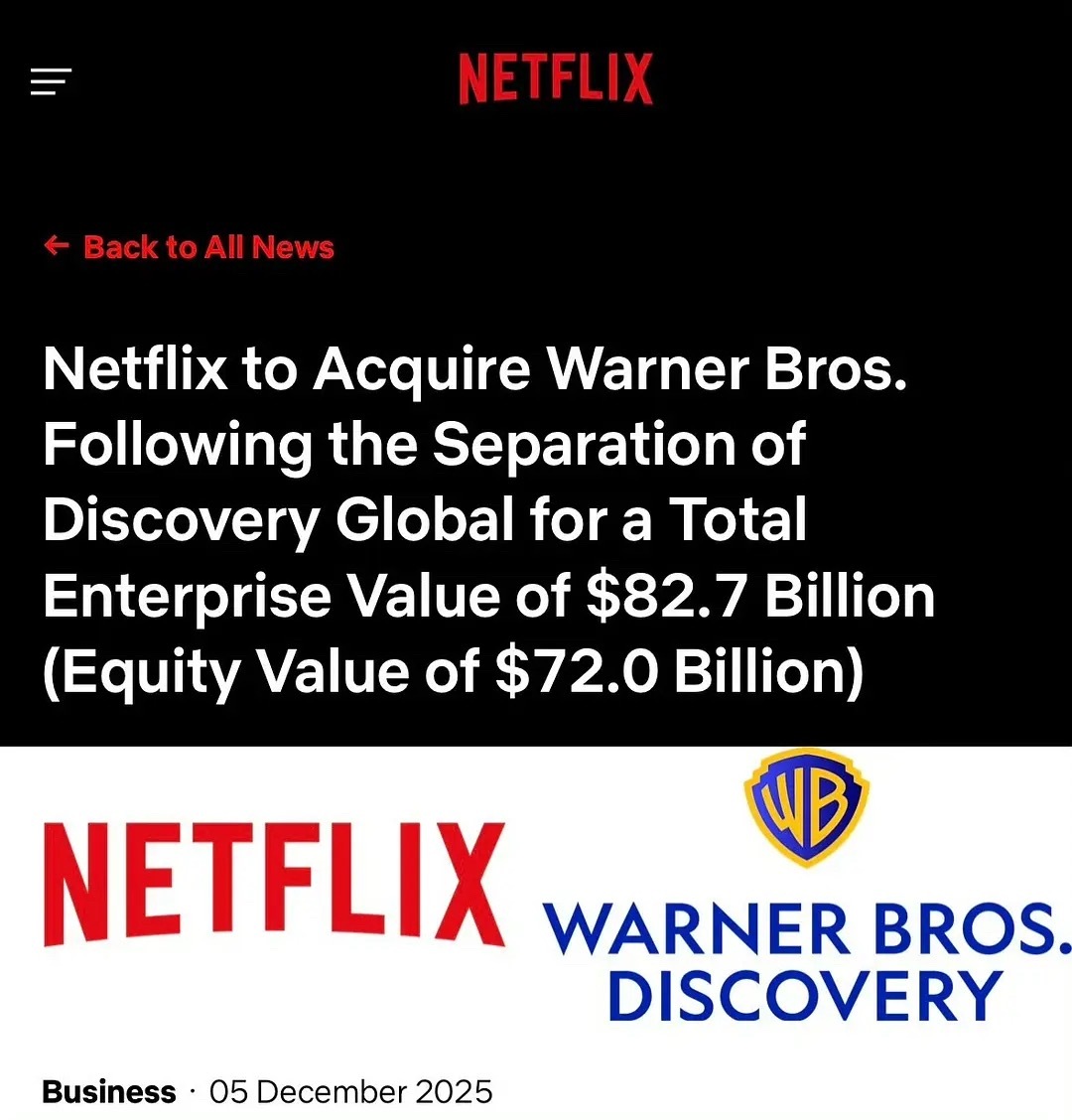 今天网飞官宣收购华纳兄弟,将携手定义下一个百年的叙事艺术,为全球观众带来非凡的娱