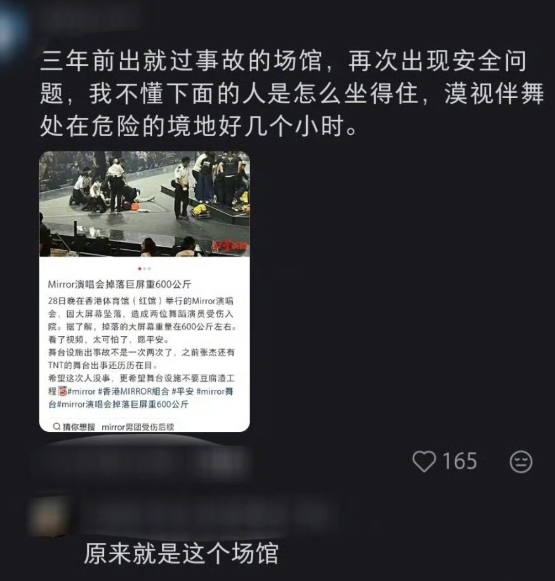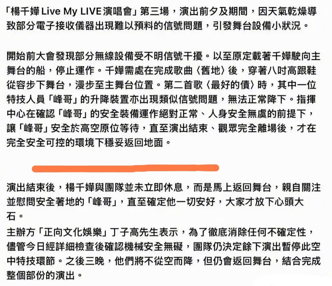太抽象了,杨千嬅演唱会的伴舞小哥因为威亚坏了,结果被吊在钢架上面几个小时。整个演唱会就在上面待着。虽然说指挥中心确认舞伴的安全装置正常,人身没有什么大的危险。但是平心而论,那个架子本身其实好像也不怎么结实。退一万步说,就算架子结实,也不应该把人放在上面吧?之前就闹出过演唱会现场东西掉下来,把人家舞伴砸坏了的事情。这次就闹出这样的事情。虽然明星的生命是命,但是普通人的命也不是这么不值钱吧?