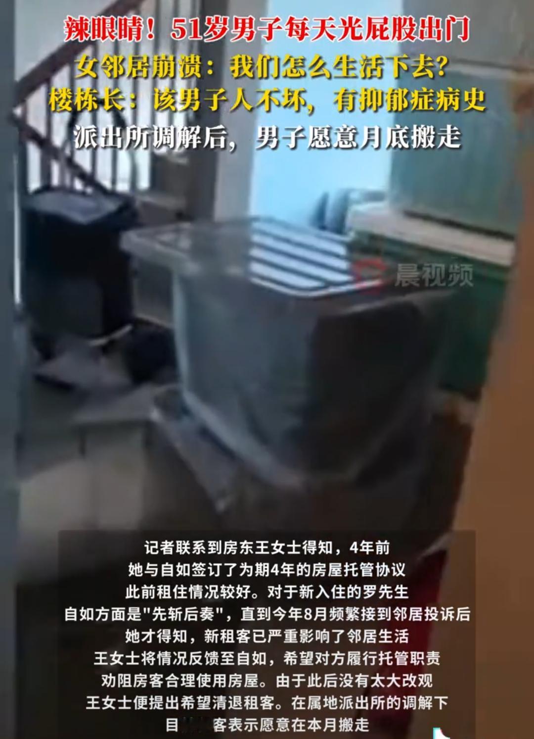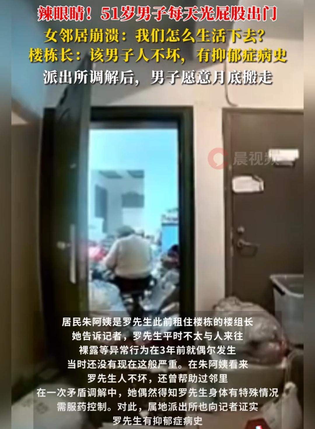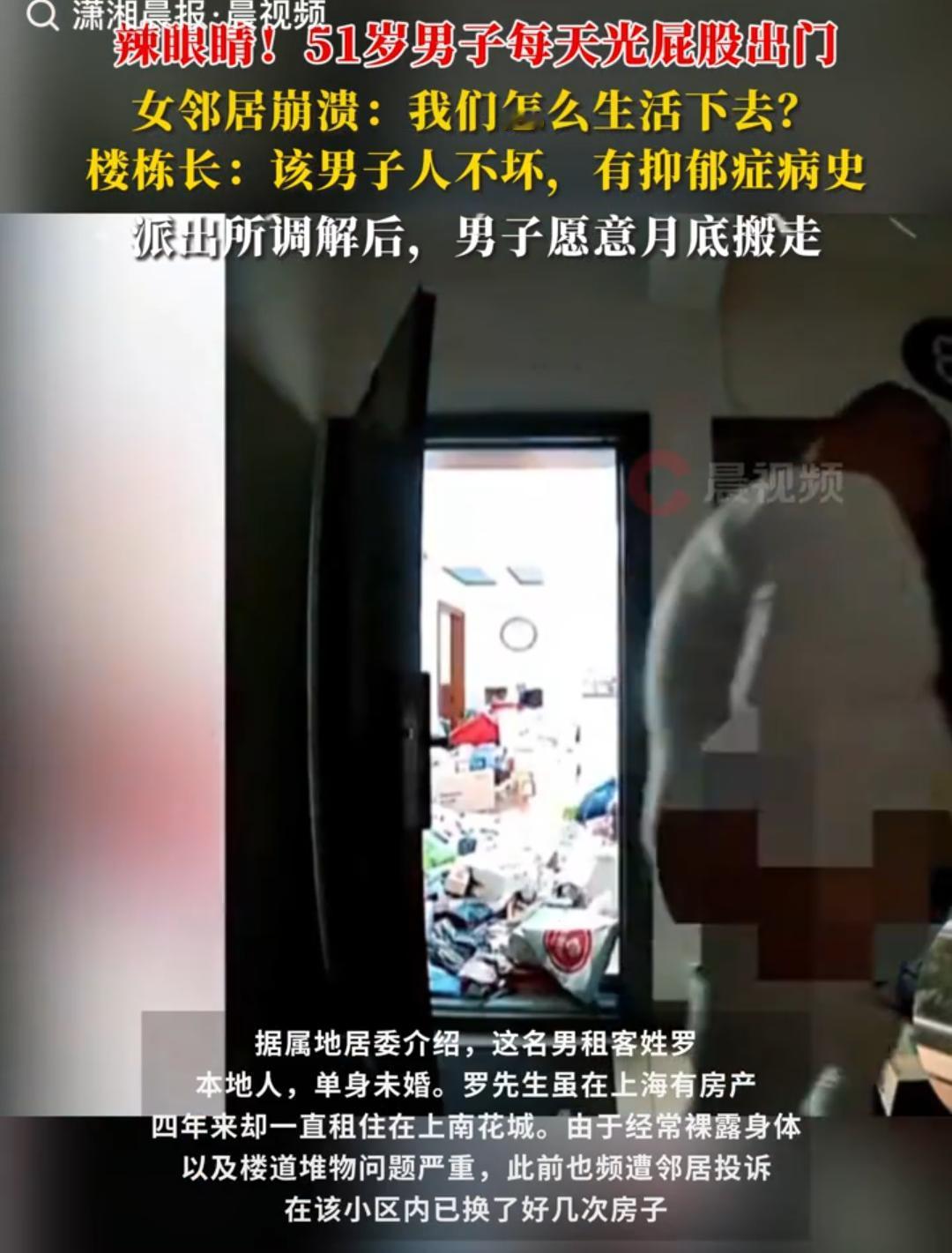 辣眼睛!51岁男子整天光屁股出门,女邻居苦不堪言:这种情况每天都会发生。 男子是单身,在上海有属于自己的房子,但他却在外面租房子住,在租的小区经常光屁股出门,被邻居投诉几次,然而他并没有搬离小区,而是在小区换房子租。 据该小区的楼栋长说,男子裸露等异常行为是3年前开始的,现在比之前严重了很多,男子人不坏,只是病了而已(抑郁症),平时靠吃药控制住。 近日,男子又被邻居投诉,房东要求男子搬离,男子同意在月底搬离,会继续在小区找房子租,只是不知道会不会有房东愿意租给他。 我不理解的是,男子有房子不住,而且只在本小区租房住呢?是不是他的病也跟这个小区有关呢?