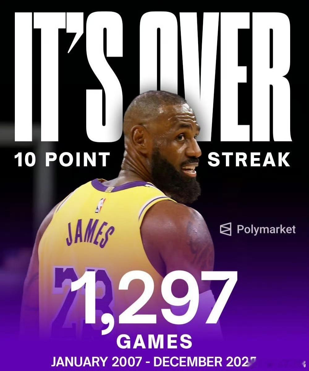 震惊!来看看詹姆斯第一次得分未上双的比赛联盟都是什么样的!詹姆斯上一次常规赛得分未能上双,还要追溯到2007年1月6日。这个时间点距今已超过18年,足以让一个婴儿成长为职业球员,不得不承认詹姆斯真的是“活化石”!自那天起至今,除了詹姆斯本人,联盟中仅有6名球员依然在役!杜兰特——当时还是未进入联盟的天才新秀。保罗——当时仅是二年级生。霍福德和康利——当时还是NCAA的大学生。杰夫格林和洛瑞——当时分别是大学球员和新秀。再比如这些:25年状元弗拉格,在2007年时才刚出生15天。许多“00后”球星,如爱德华兹、哈利伯顿等,当时也只是学龄前儿童。包括库里(2009年选秀)、哈登(2009年选秀)、字母哥(2013年选秀)、约基奇(2014年选秀)和东契奇(2018年选秀)等一众MVP级球星,当时都还未登陆NBA。再包括主教练雷迪克当时都还是独行侠的新秀球员只打了8场比赛!一组更直观的数据:从2007年1月6日到2025年12月5日,詹姆斯保持了连续1297场得分上双的纪录。在超过20年的职业生涯中,詹姆斯得分未上双的比赛总共只有9场,这甚至比他进入总决赛的次数(10次)还要少。詹姆斯延续得分上双纪录詹姆斯湖人洛杉矶湖人
