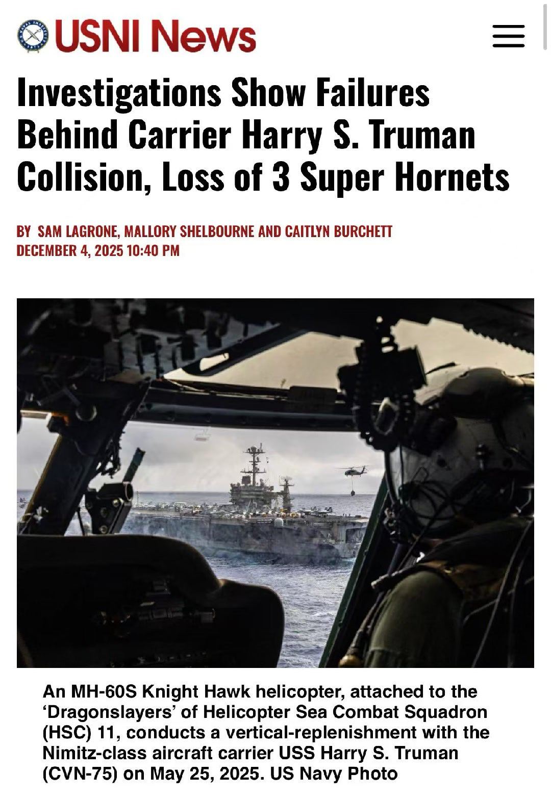 美国海军调查报告披露,2024年12月在红海发生的一起严重“友军误击”事件细节。当时,隶属于“杜鲁门”号航空母舰打击群的“葛底斯堡”号导弹巡洋舰将三架F/A-18“超级大黄蜂”战斗机误识别为敌方反舰导弹,向其中两架开火,导致一架被击落。12月22日凌晨,该舰向正在执行任务的一架“超级大黄蜂”战斗机发射导弹,机上两名飞行员原以为导弹是在追击他们尚未发觉的附近无人机,但导弹在爬升后突然改变方向朝他们飞来。一名飞行员说当时他“看到了人生走马灯”,两人在被导弹击中前弹射逃生,这架价值约6000万美元的战机坠海。这只是“杜鲁门”号航母打击群在部署时发生的多起事故之一,此前还发生过航母与货船相撞以及两架战机分别从甲板坠海的事件。美军在东太平洋发动致命打击