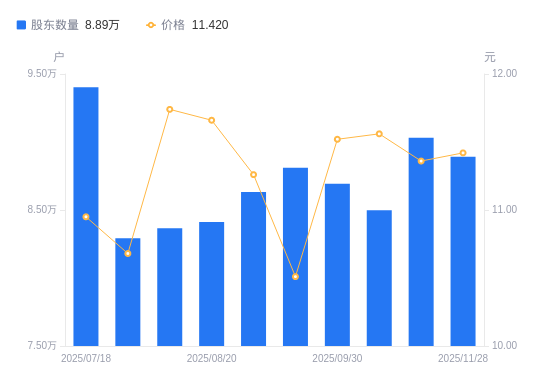 日期A股户数(户)流通A股户均持股数(股)户均持股市值(万元)2025-11-288891315493.7317.692025-11-109030515254.9017.332025-10-108497816211.1918.742025-09-308693615846.0718.252025-09-198811515634.0516.432025-08-298631715959.7117.972025-08-208411916376.7319.102025-08-088366316465.9919.332025-07-318292916611.7317.742025-07-189401814652.4516.04