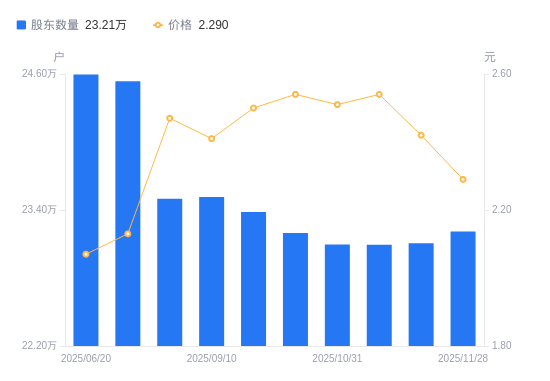 日期A股户数(户)流通A股户均持股数(股)户均持股市值(万元)2025-11-2823211244527.7010.202025-11-2023105944730.6210.822025-11-1023092344756.9611.372025-10-3123095344751.1511.232025-09-3023196144556.6811.322025-09-1923383344199.9711.052025-09-1023515643951.3010.592025-08-2923500343979.9210.862025-06-3024535842123.808.972025-06-2024596142020.538.70