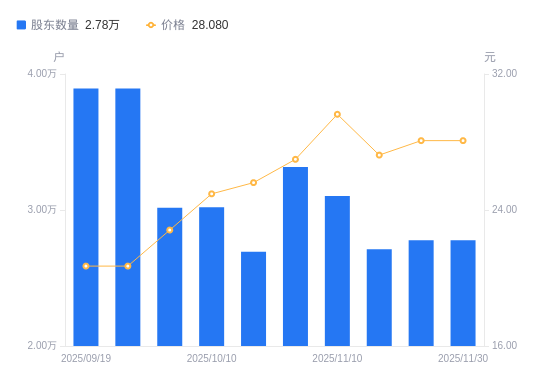日期A股户数(户)流通A股户均持股数(股)户均持股市值(万元)2025-11-30277695259.4214.772025-11-28277695259.4214.772025-11-20271125386.8714.672025-11-10310324706.4013.952025-10-31331654403.7111.882025-10-20269395421.4713.882025-10-10302024835.7412.072025-09-30301674841.3511.052025-09-20389323751.397.772025-09-19389323751.397.77