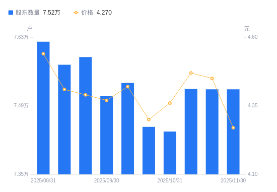日期A股户数(户)流通A股户均持股数(股)户均持股市值(万元)2025-11-307523844815.6319.142025-11-207523844815.6319.942025-11-107524644810.8620.032025-10-317437445336.2519.772025-10-207447045277.8119.472025-10-107536844738.3319.772025-09-307510044897.9819.622025-09-207589644427.0919.502025-09-107573844519.7719.632025-08-317621044244.0420.09