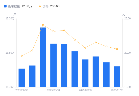 日期A股户数(户)流通A股户均持股数(股)户均持股市值(万元)2025-11-2812795511053.1522.732025-11-2013007410873.0922.772025-11-1013311910624.3822.862025-09-3013155710750.5222.322025-09-1913586810409.4122.842025-08-2013948510139.4923.602025-08-0813987910110.9323.402025-07-311483409534.2222.972025-07-1812839411015.3622.432025-06-3012673011160.0021.86