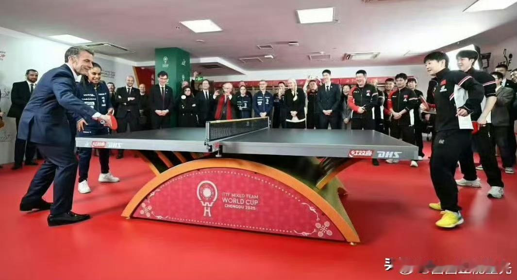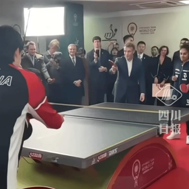 法国总统马克龙一直在喊莎莎给他发球[赞] 今天法国总统来找国乒运动员们打球了,而且还点名喊莎莎,最后马克龙和队友如愿对阵我们的奥运混双冠军,王楚钦和孙颖莎 期间,马克龙一直在喊莎莎,希望莎莎发球给他,别说,总统打球还不错哦!那个拿拍子的动作很标准的呀! 我就知道都在一个城市,肯定会有安排的,别说,总统行程还挺满的