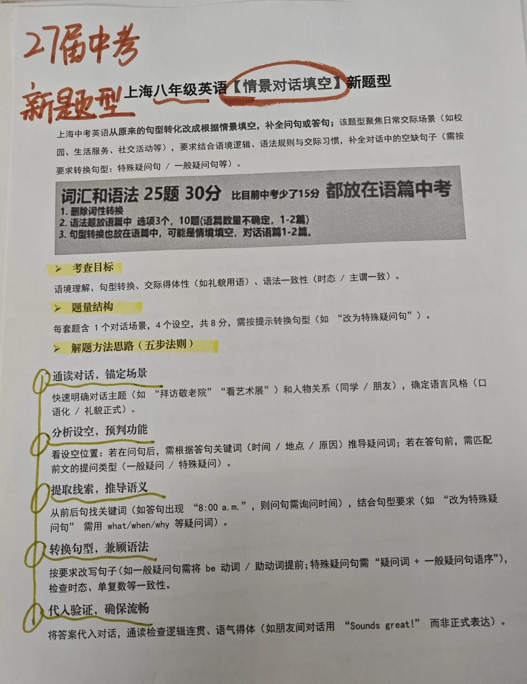 心疼上海初二生!27届中考英语真的大变天了 27届上海中考英语大变天,新增题型【情景对话填空】难度真的大,不得不说现初二明年备战中考将难度倍增 . 👉给大家整理了新题型【情景对话填空】样题练习 八年级同学打印下来做,提前适应新题型难度和出题方向,明年中考轻松140+ 上海初升高 上海中考 上海八年级 上海新初三上海中考英语 上海中考新政 上海初中英语