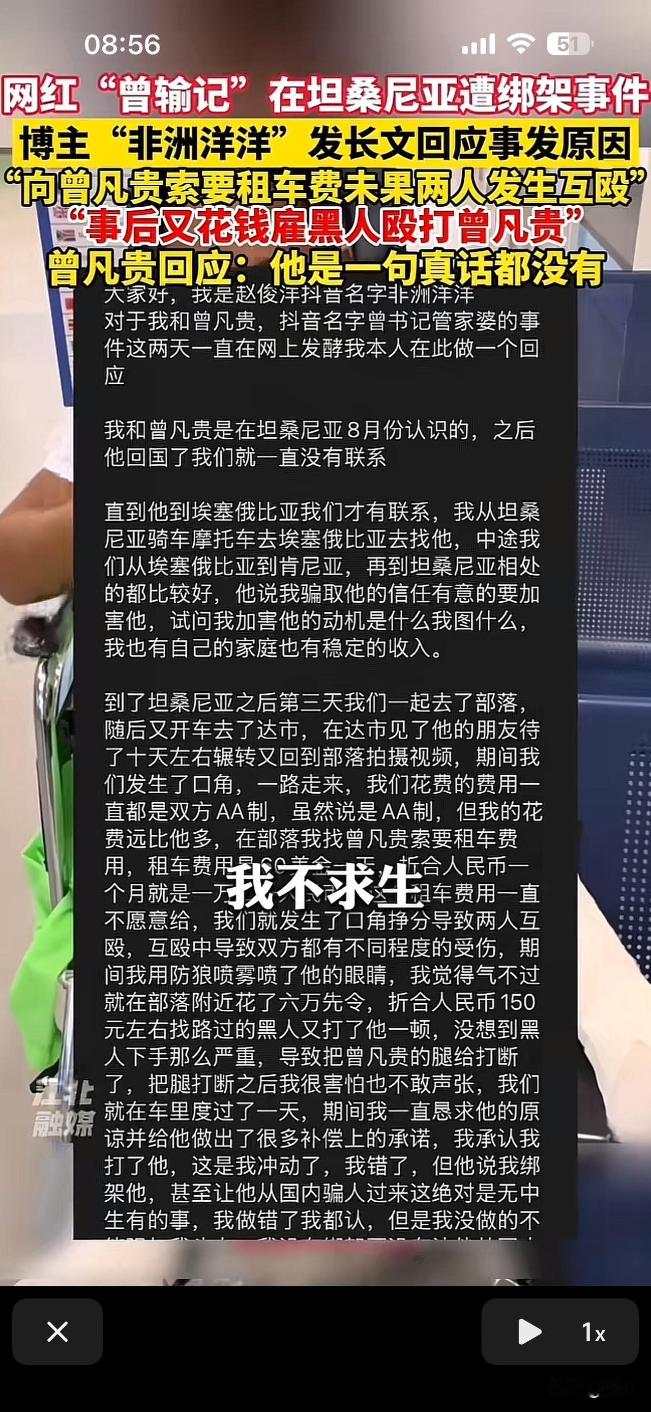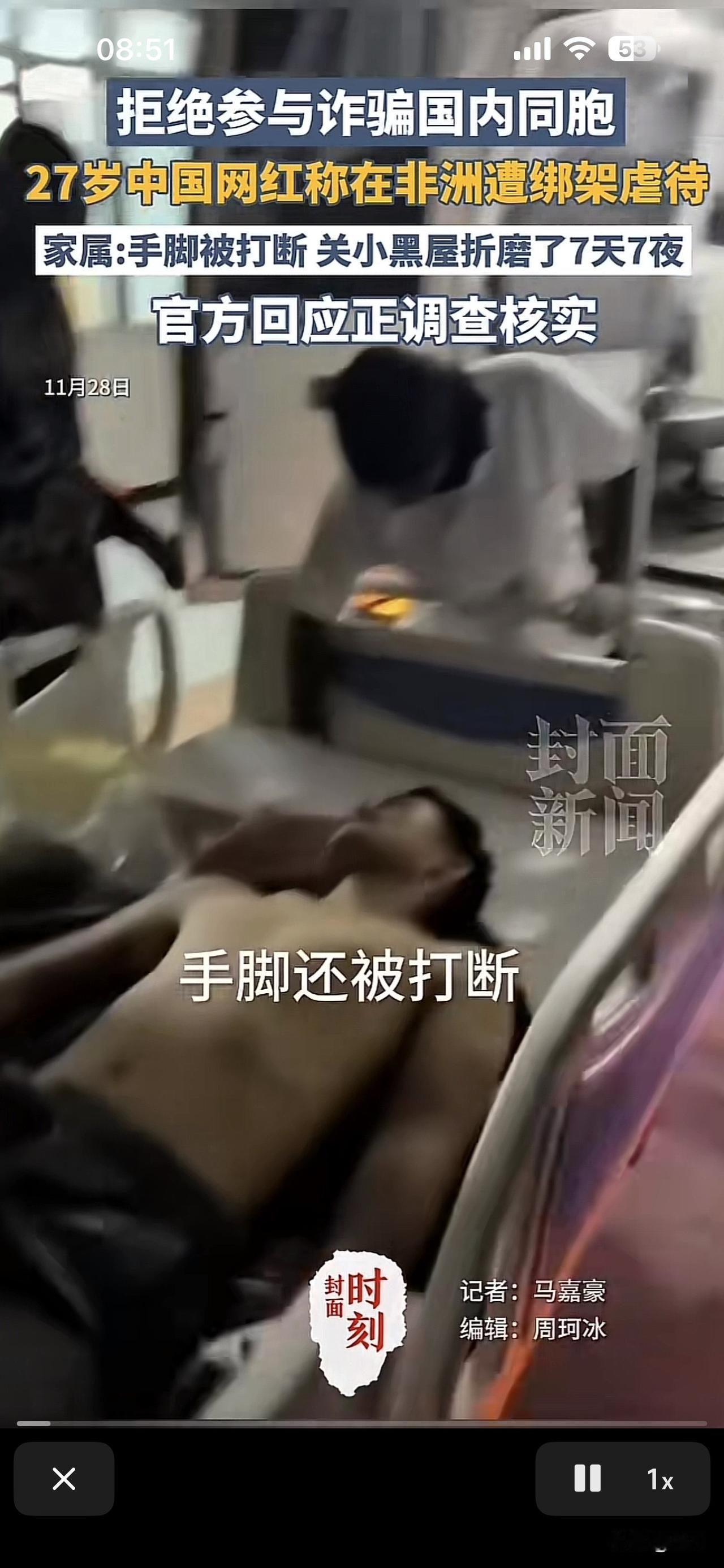 当事人回应:腿被打断,他要我骗有钱人过来。要求治腿才发现逃跑机会。 博主:“非洲