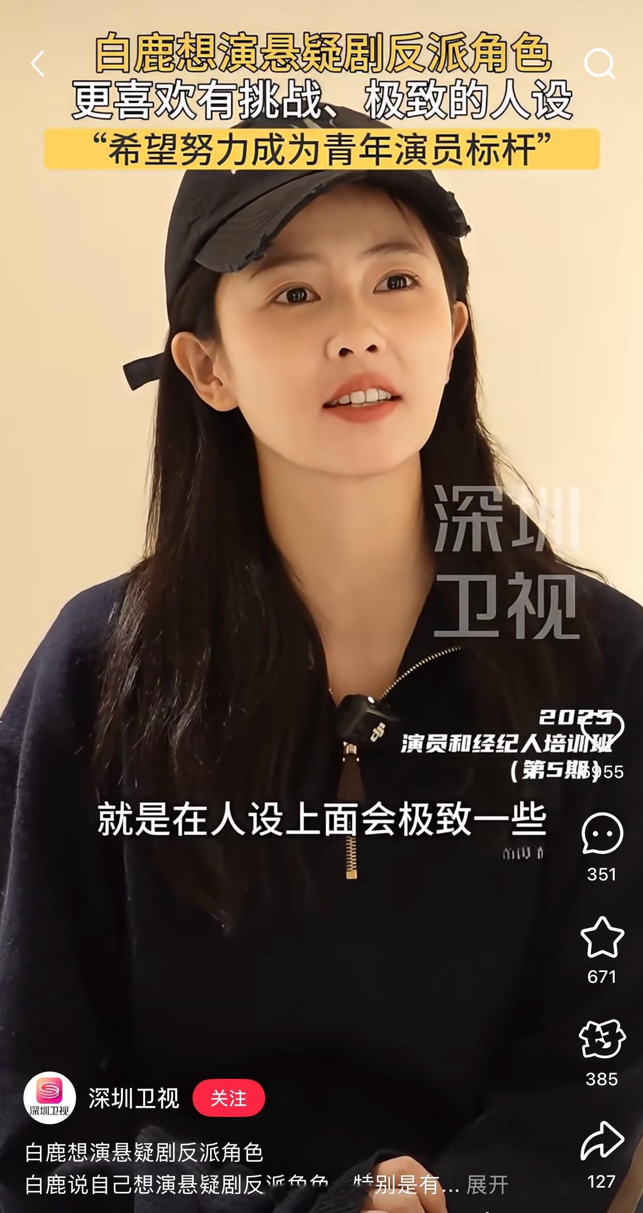 白鹿在国家广电总局演员与培训班(第5期)说曾因番位之争错失心仪的合作演员,对表演要有敬畏之心,目前更想尝试悬疑剧反派角色,想努力成为青年演员标杆。