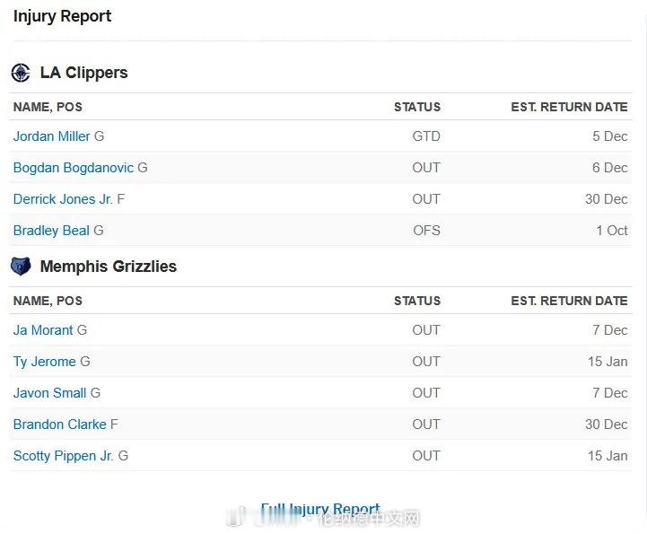 比赛预告:明早9点,快船客场对阵灰熊!伤病报告:小琼斯、博格丹缺席、比尔赛季报销