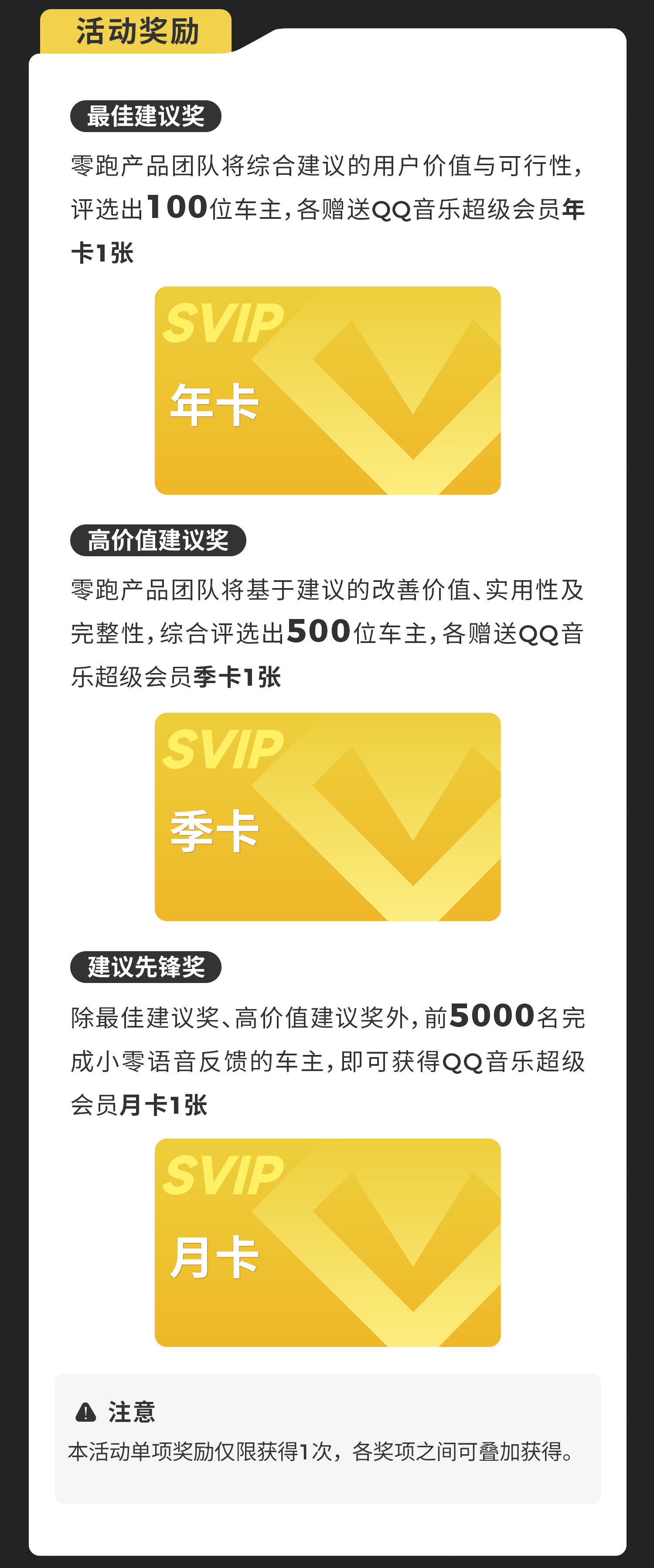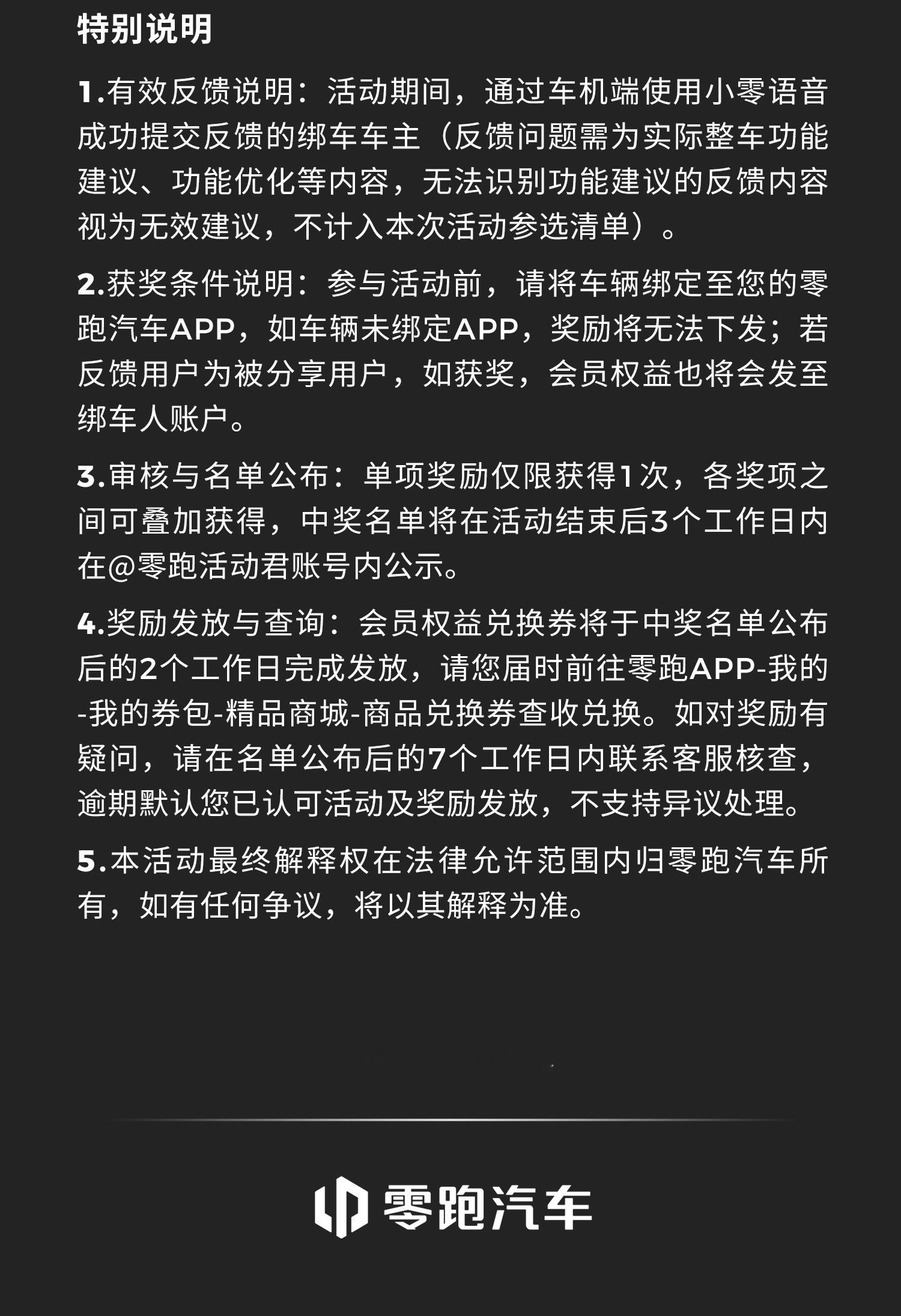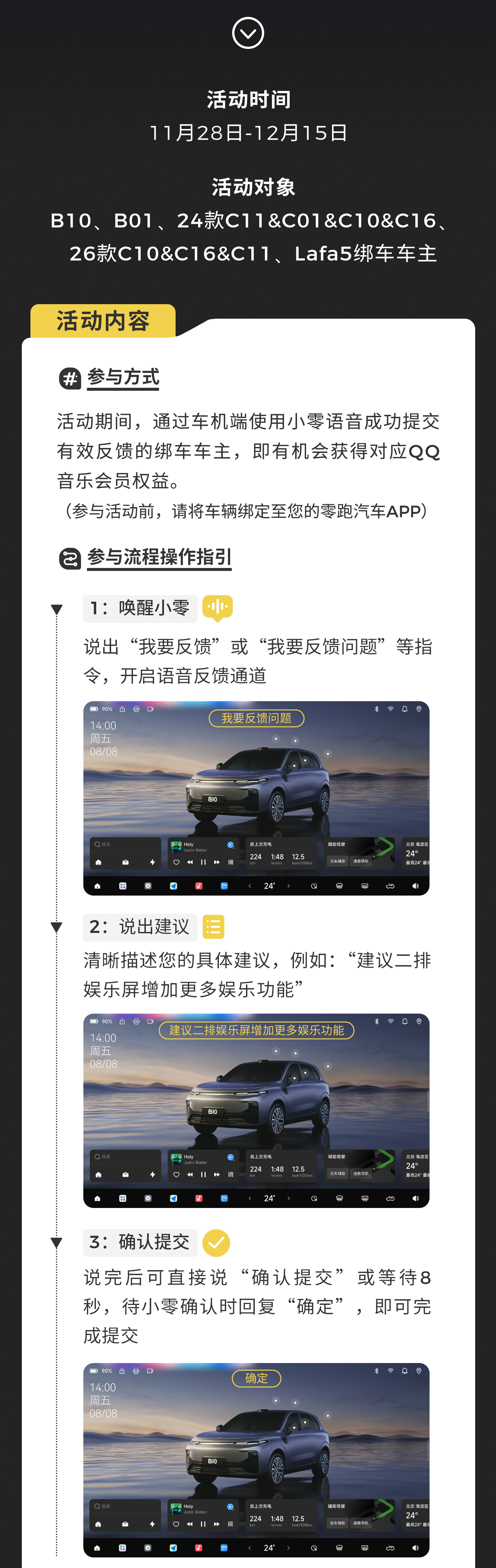 🚗零跑车机【小零语音反馈】功能上线啦。零居提建议,零跑送好礼!5000张QQ音乐超级会员月卡,先到先得。只需三步:1️⃣唤醒小零“你好小零”-2️⃣提建议-3️⃣确认提交领好礼🎶领取方式:QQ音乐会员以券码发放到零跑APP,使用你车机绑定的手机号登录领取。🎁转发+关注,抽100位幸运儿,送上QQ音乐超级会员年卡1张 抽奖详情