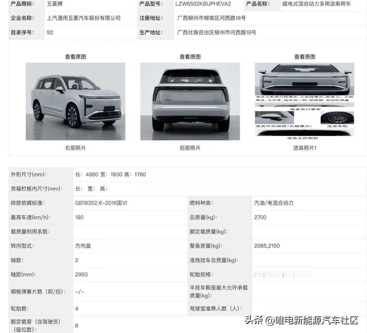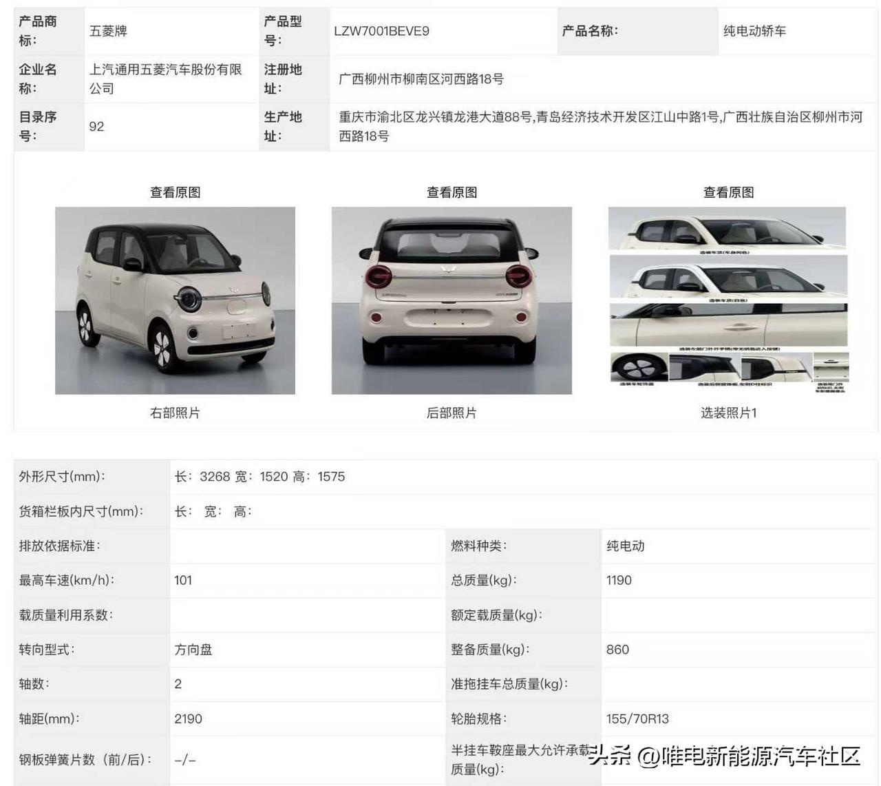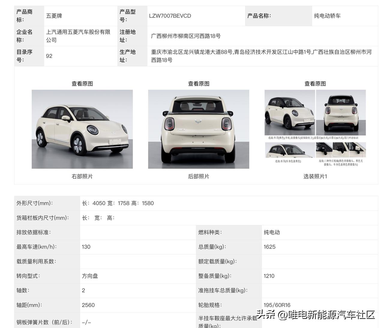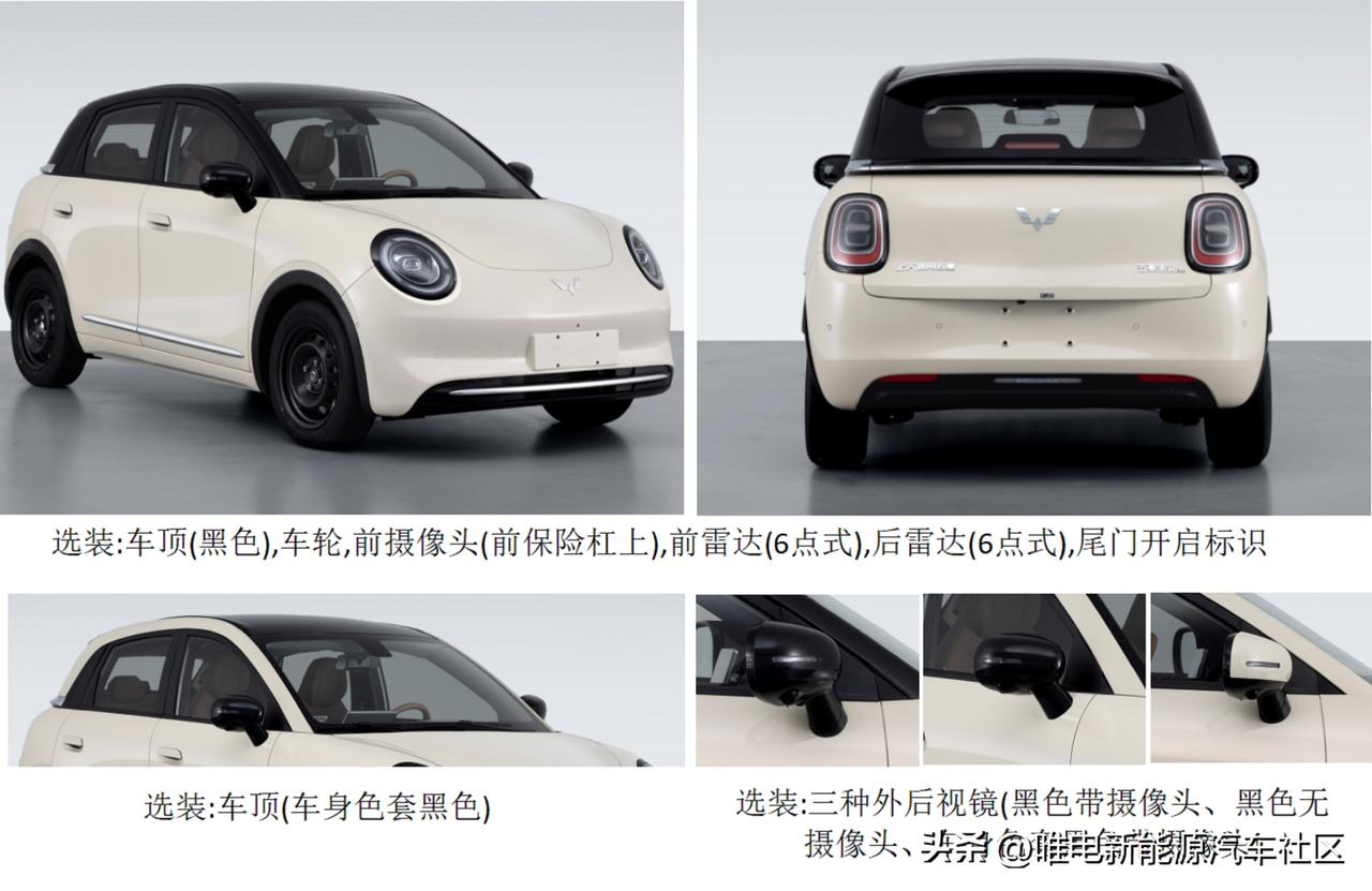 工信部第402批,五菱的三款新车[思考] -第五代宏光MINIEV:车身尺寸3268×1520×1575mm,轴距2190mm,前后车灯改成了圆形,电机峰值功率30kW; -缤果Pro:车身尺寸4050×1758×1580mm,轴距2560mm,也同样采用非常可爱的圆灯,电机峰值功率65kW; -星光L:插混五/六座SUV,车身尺寸4980×1930×1760mm,2950mm,电池容量31.0/37.9kWh,纯电续航里程244/298km[思考]