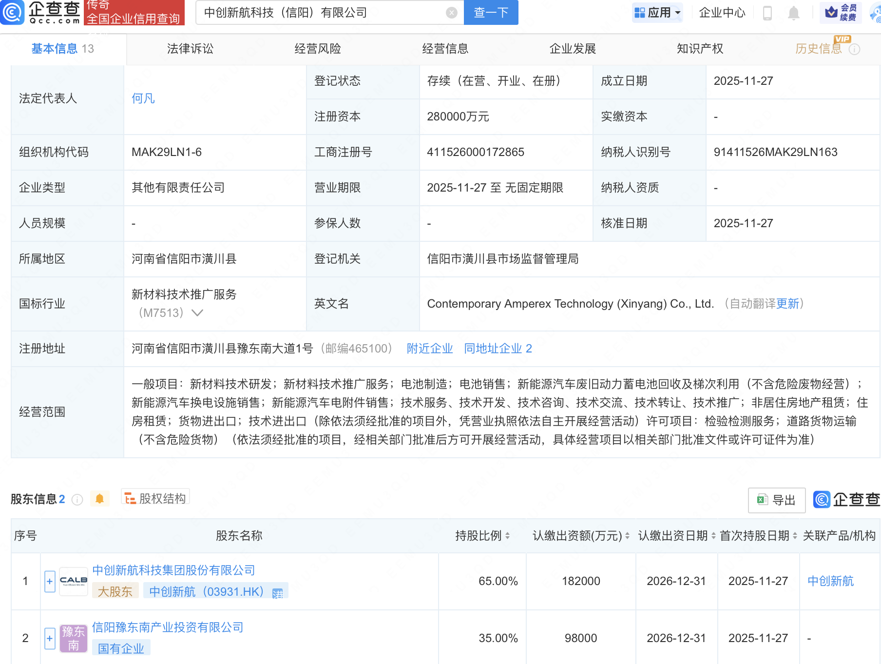 企查查APP显示,近日,中创新航科技(信阳)有限公司成立,注册资本28亿元,经营范围包含:新材料技术研发;新材料技术推广服务;电池制造;电池销售等。企查查股权穿透显示,该公司由中创新航(03931.HK)等共同持股。