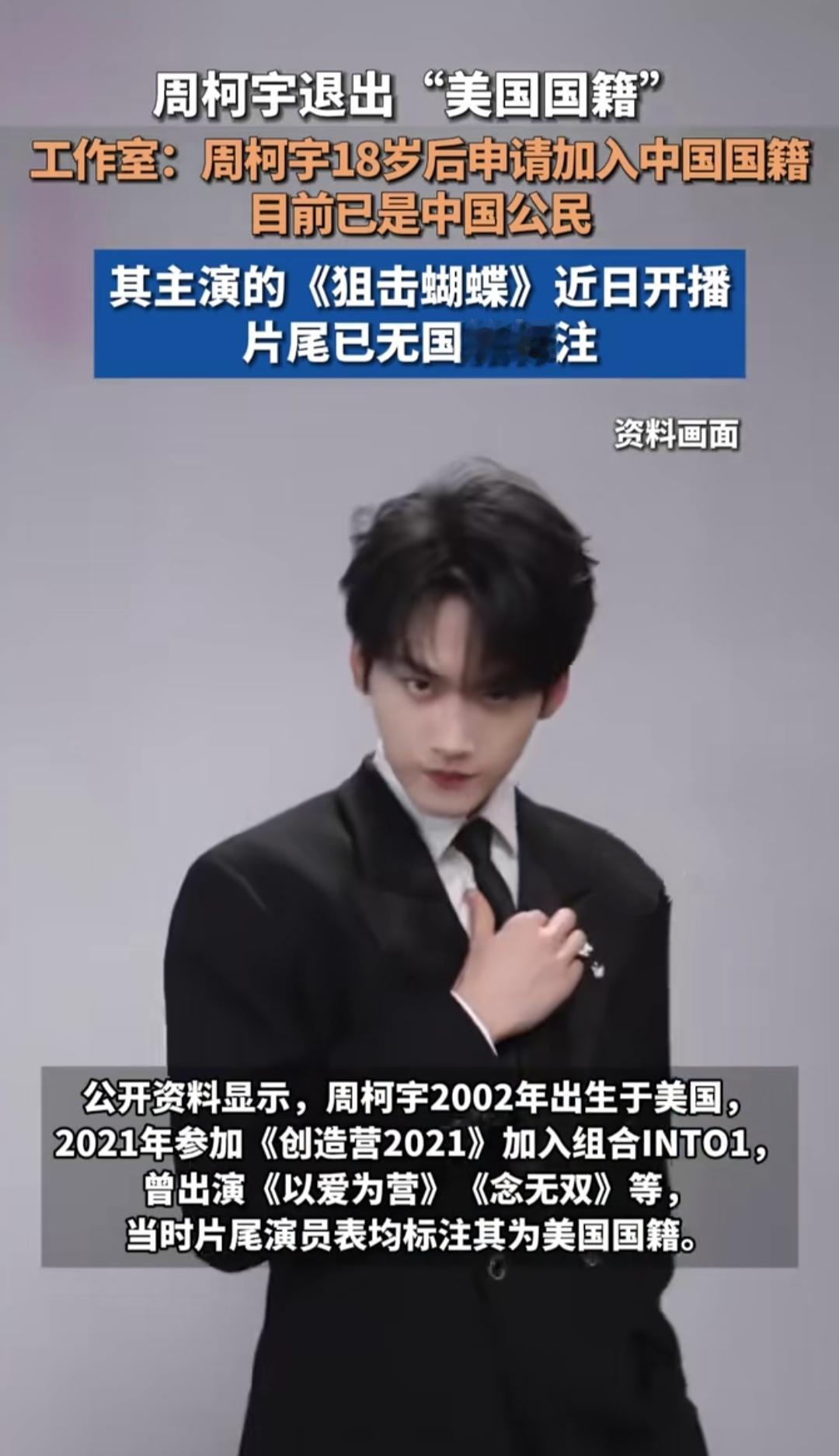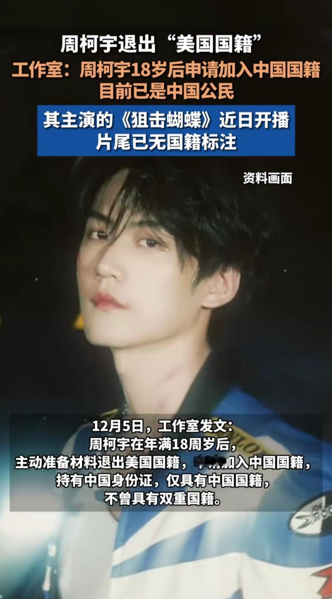 周柯宇工作室刚官宣:他满18岁后主动退了美国国籍,现在是中国公民,连《狙击蝴蝶》的片尾演员表都没了国籍标注——这波真的很让人感慨。 他2002年出生在美国,之前演《以爱为营》时还标着美国国籍,现在主动放弃外国籍、拿中国身份证,这态度够实在。刚好新剧《狙击蝴蝶》刚开播,网友刷到演员表都在说“这波好感直接拉满”。 对公众人物来说,国籍从来不是小事,主动选择中国籍,是最直接的态度。你追《狙击蝴蝶》了吗?觉得周柯宇这波操作怎么样?