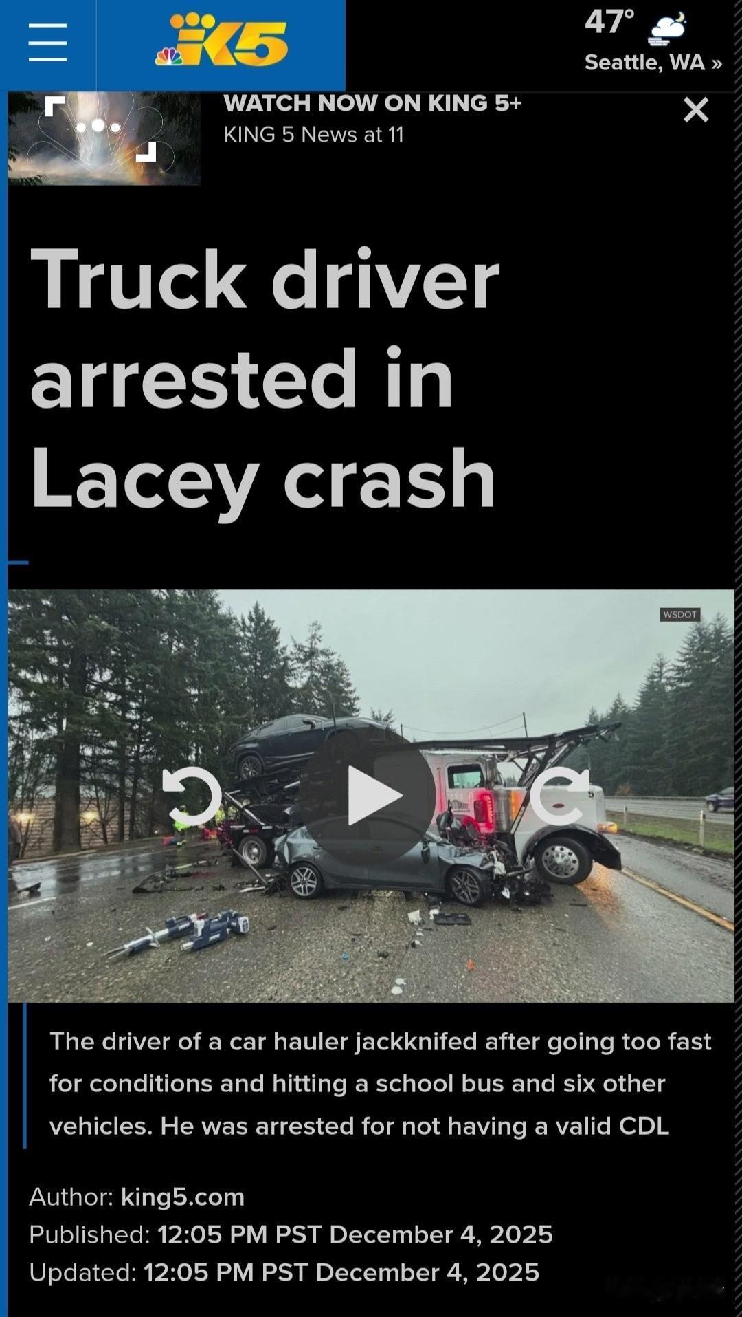 最新消息:周四,一名来自墨西哥温蒂特兰的商业卡车司机胡安·埃尔南德斯-桑托斯在美国华盛顿州莱西市的 I-5 号州际公路上发生的 6 车连环相撞事故现场被捕。 司机当时正驾驶一辆汽车运输车,在早上 7 点后撞上了校车的尾部,而且他没有商业驾驶执照、保险或有效的医疗卡。 四人因轻伤被送往医院。 Hernandez-Santos 因无有效驾照驾驶商用车辆而被控犯有严重轻罪,并被关押在瑟斯顿县监狱。