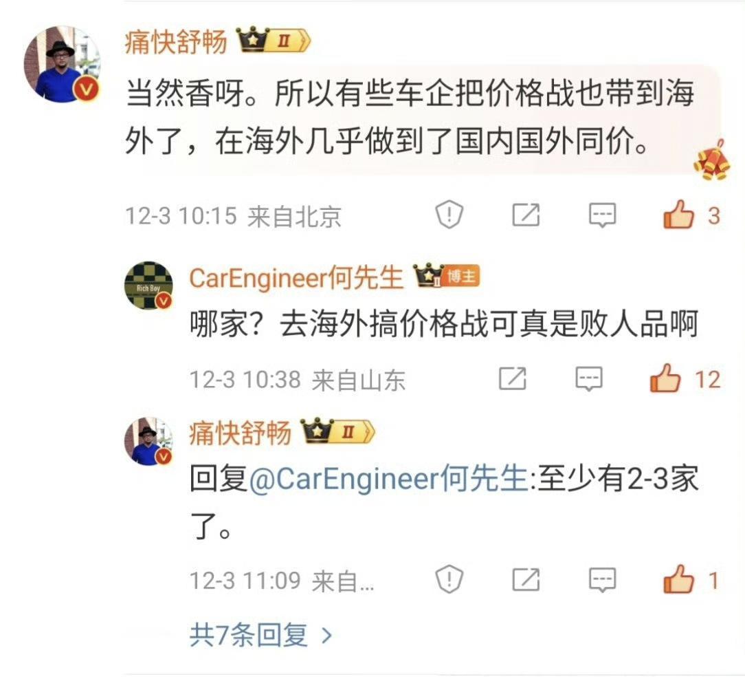 听说有些车企把【价格战】带到了海外汽车市场? 这绝对是【断子绝孙】式的竞争手段,中国车企出海一定要尊重当地的价格体系,尊重当地的法律法规,不要瞎卷。 别人都卖30万一辆车,你为了抢市场卖20万,你就会被贴上扰乱市场,搞倾销,破坏价格体系的标签,海外甚至会把价格低跟品质差联系起来。 车企出海,千万别瞎卷,别再用低价去打开市场了。【来自懂车帝车友圈】