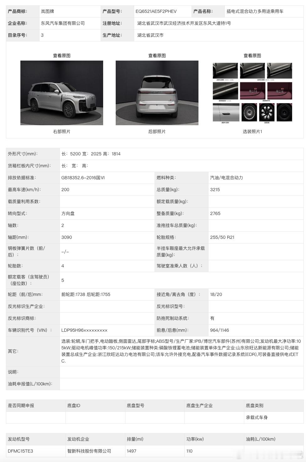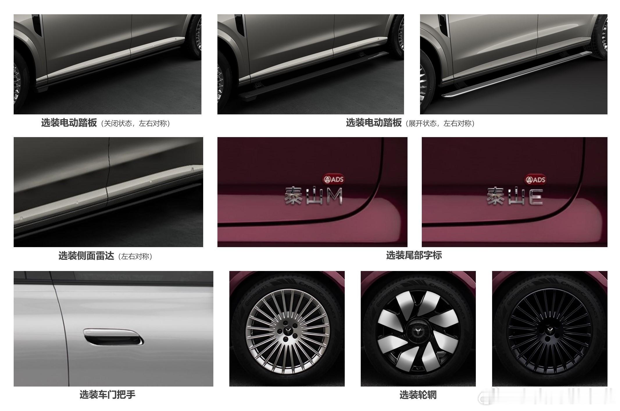 岚图又申报了两款泰山系列,泰山 M 或泰山 E。尺寸方面,长宽高分别是5200*2025*1814mm,轴距是 3090mm。这个尺寸对比泰山的 5230*2025*1817mm 的长宽高以及 3120mm 的轴距,泰山 M 或泰山 E 的定位肯定是小于泰山的。而且从尺寸看,泰山是 9 系旗舰 SUV,那泰山 M 或 E 应该就是 8 系的定位,类似问界 M8 或理想 L8 那样。而且从配置来看,华为 ADS 辅助驾驶也是有的、电动踏板、电动门也是有的,动力也是 150/230kW 驱动电机,峰值功率 110kW 的发动机。新能源汽车大v聊车