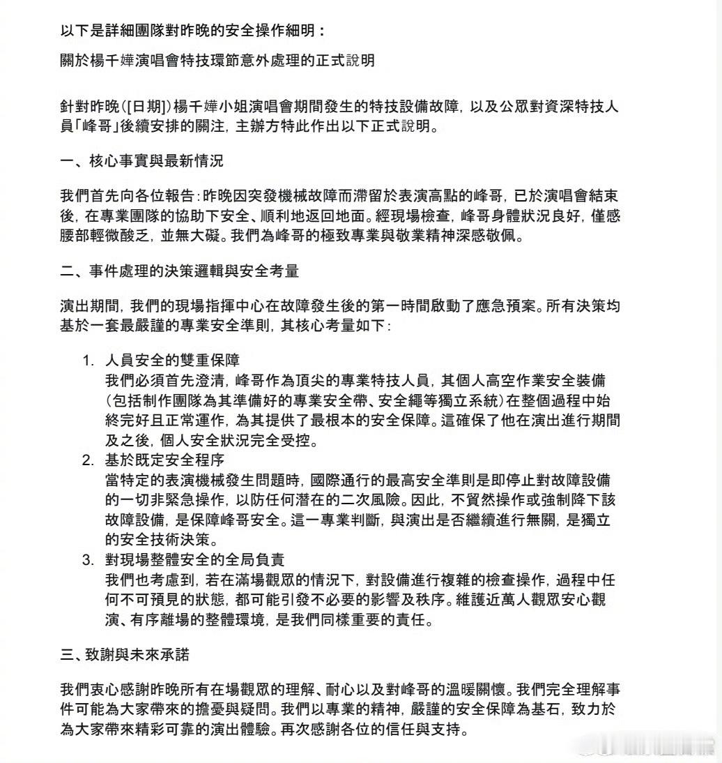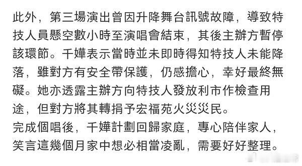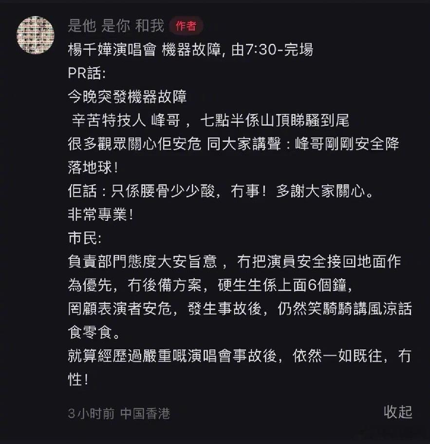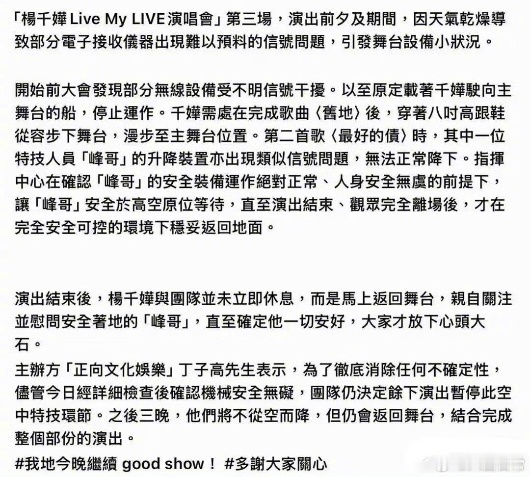 杨千嬅演唱会由于机器故障,致使一名特技人员在空中吊了数个小时演唱会结束后,主办方表示当时是在确定特技人员绝对安全的情况下,做出让他处于高处原地等待的决定,直到观众离场后才把他放回地面。杨千嬅表示当时不知道特技人员未能降落,虽对方有安全带保护但仍感担心,幸好最终无碍