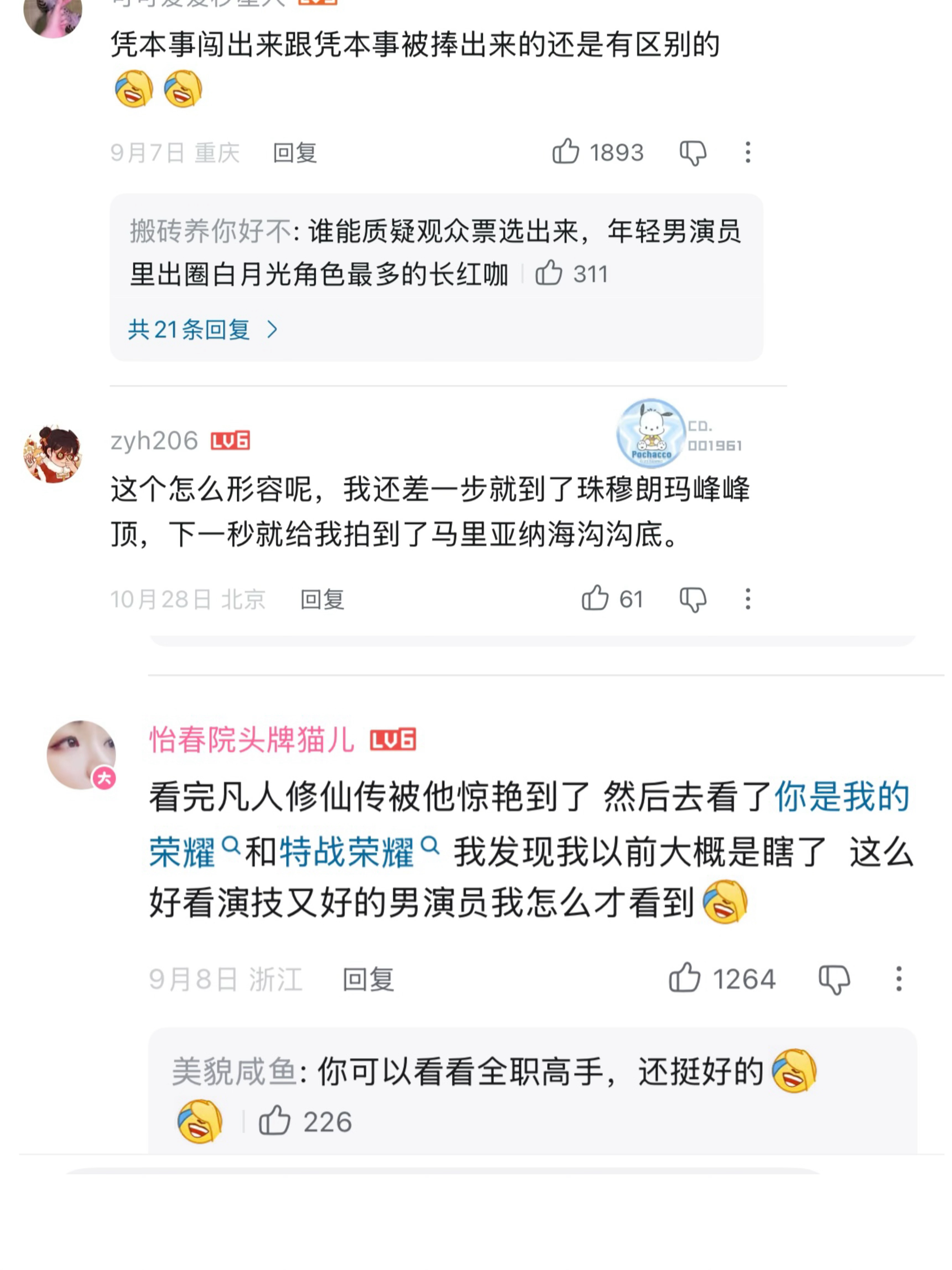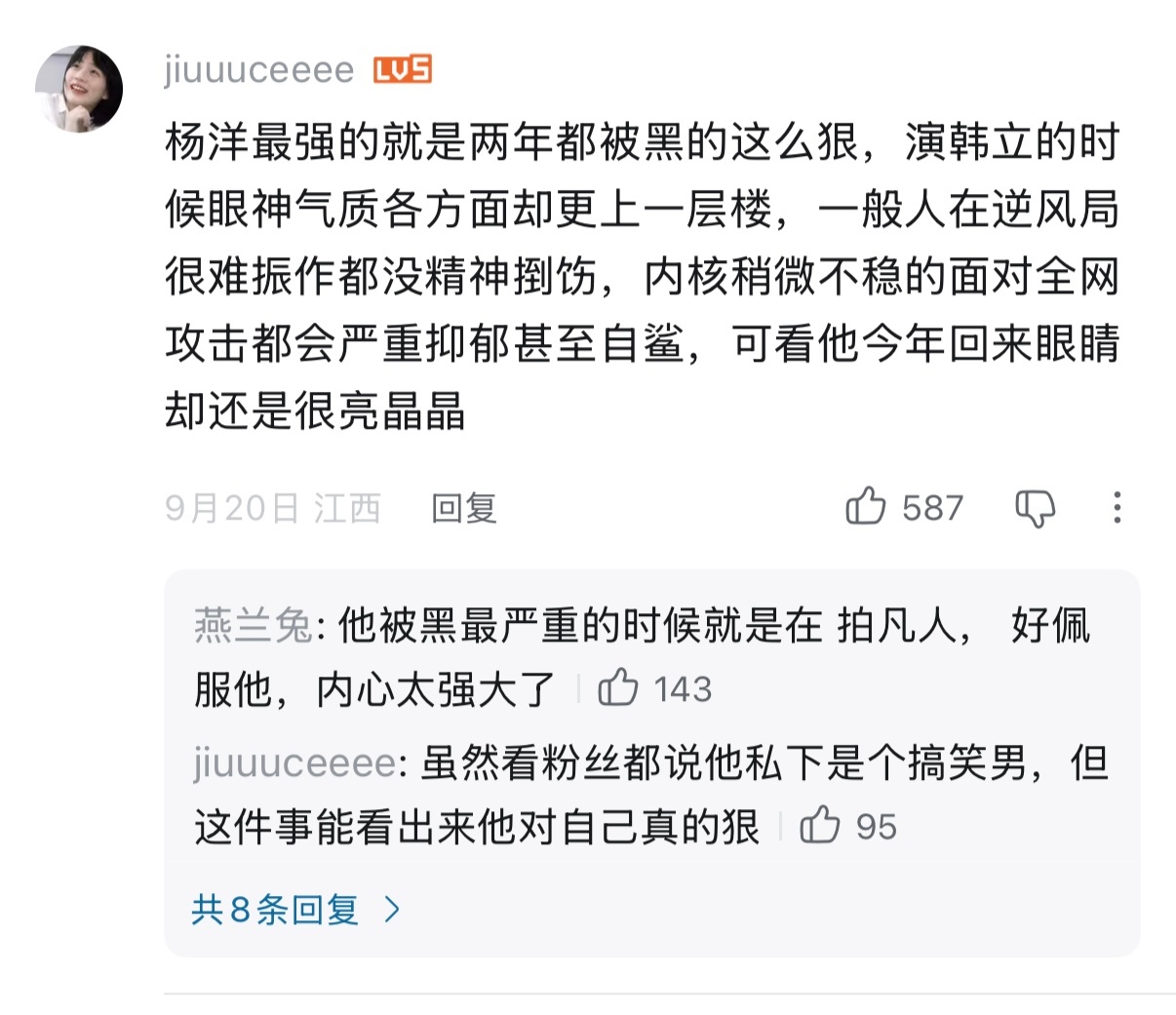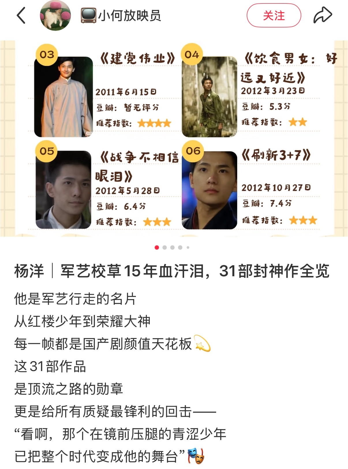这两年不仅仅是女性的自主意识,大众的判断力也在觉醒,对于一些观点人云亦云的少了。比如某些配角辣菜主角上位,大家开始思考这个问题背后的逻辑,如果单扛能力足够就不用来别人的剧里作妖了。拿我自己来说,2023就会有这样模模糊糊的概念莫名讨厌河童,而到了今年看到又有配角想给自己镀上一层童年白月光的滤镜的时候莫名想笑,这样的误导型套路我见了两次。为什么都来吸血杨洋呢?说到底还是血条太厚又正直善良不爱营销,所以总有人试图用颜值来故意掩盖他的才华甚至泼脏水,依然难掩他的锋芒。哪怕仅仅是一段没有露脸的录音,他也凭借字正腔圆和感情充沛赢得听众青睐,更别说文戏和武戏了,但凡给个公平的评价都能看出来他藏在眼神和动作里的硬核实力。当然这不仅仅靠天赋,更是三十一部作品的沉淀,才有了如今的杨洋。最有资格最容易吃流量红利,但却要偏偏靠自己,用作品杀出一条血路。这样的杨洋只要站在那里就已经是明月高悬了,照不照我无所谓,我只要他高悬就好。