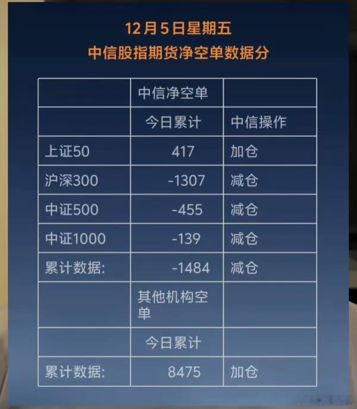 12.5周五 晚间 利空消息!中信大幅减仓了!机构也是跑路了!最新期指数据来了!中信净减仓1484手从期指数据看:刚刚才小涨一天,中信就迫不及待大幅减仓出逃,下周行情不容乐观,控制好仓位。不作为投资买卖建议,仅供参考。